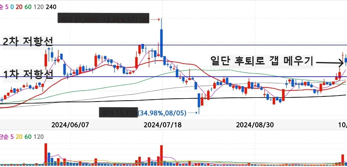 <[솟아라] 10.18. 2차 저항선 앞두고 일단 후퇴 음봉>일단 후퇴로 갭을 메우는 척 더 많은 매물을 받아내기로 결정?