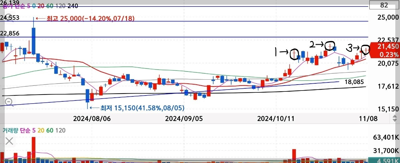 /위 그림에서 1번, 2번 붉은 도지가 뜨고 조정 또는 하락반전만 했기에 이번에 뜬 3번째 붉은 도지에 슬며시 기대를 걸어본다.(인생은 삼 세 번 아니던가?!^^)