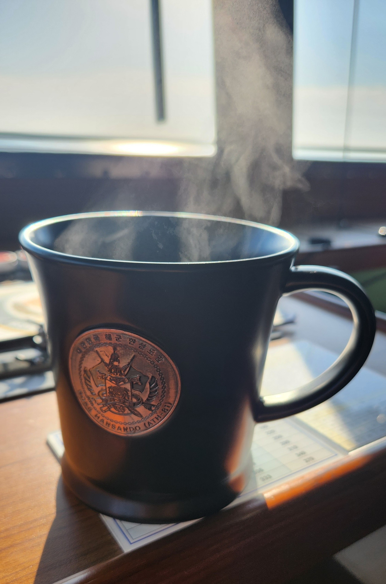 함교 함장석 깊숙이 몸을 밀어 넣으며, 커피를 받아 들고 수평선을 응시한다.