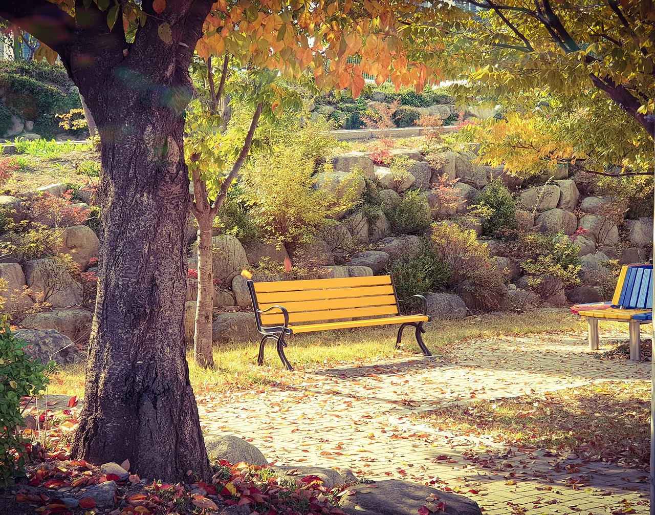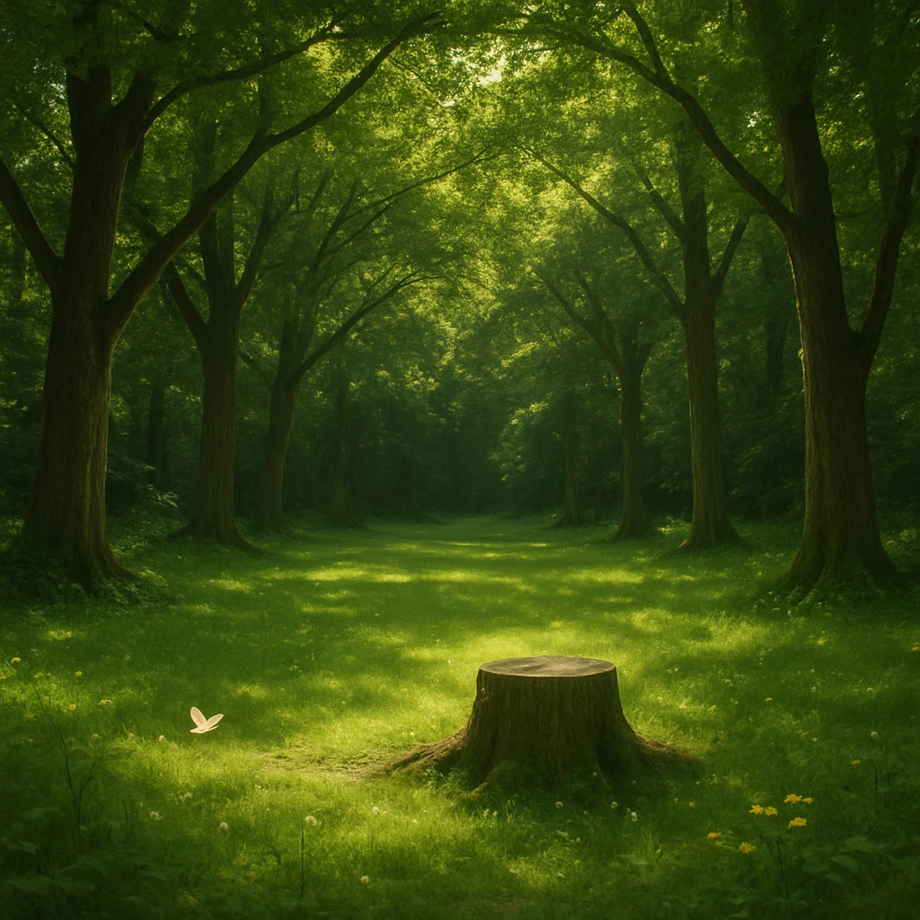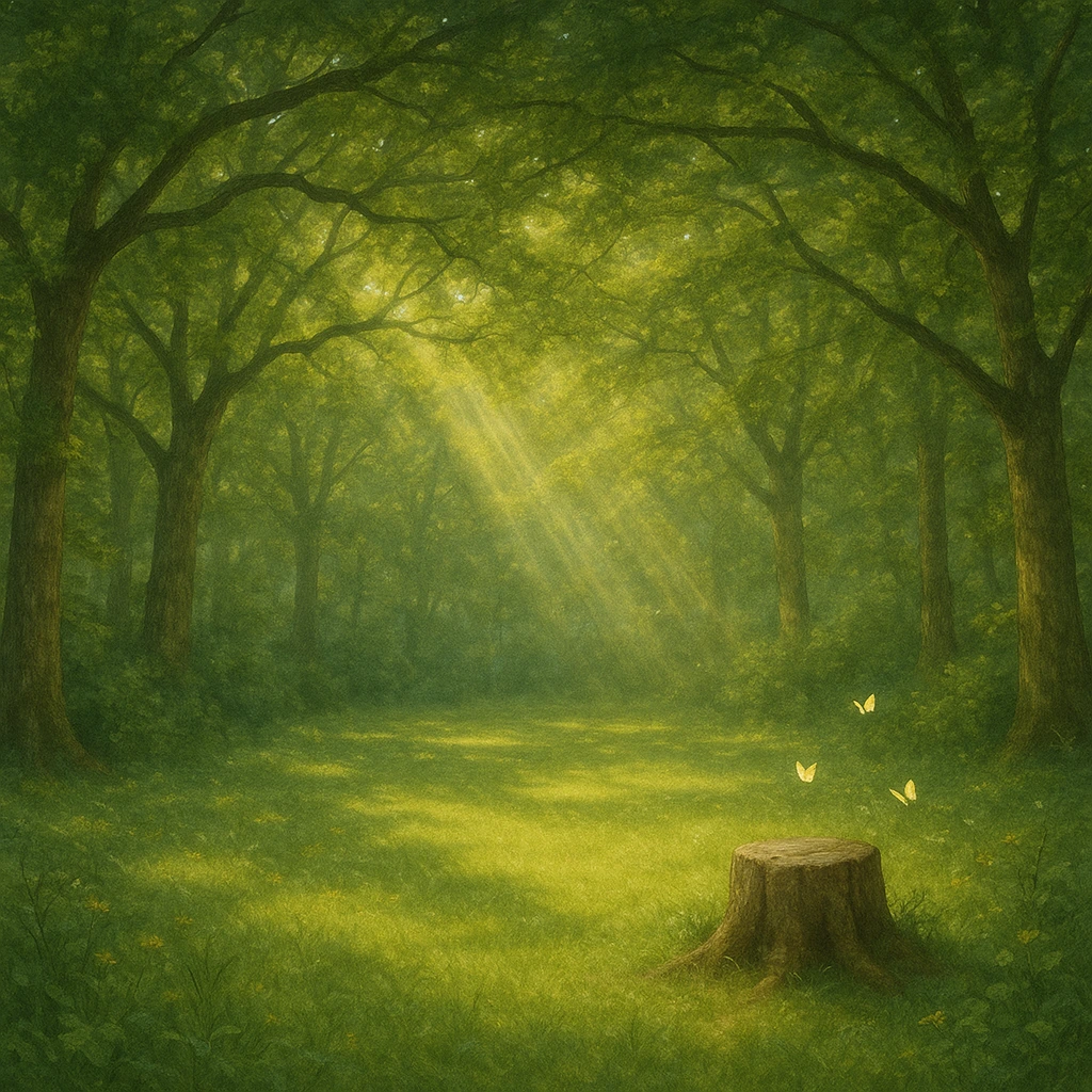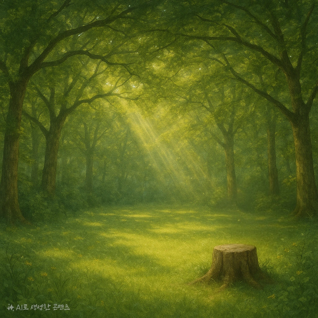 얼만큼 걸었을까? 주인집 앞마당 만한 크기의 공터가 나온다. 빼곡하던 나무들이 거기만큼은 자리를 내주어 자그마한 광장을 만들어 주었고, 울창한 나뭇가지와 나뭇잎들로 손에 손 잡아 높은 지붕을 만들어 내었다. 맞잡은 나무의 손틈들 사이로 햇빛이 쏟아져 내려 너른 풀밭의 군데군데를 비추고 있었다.