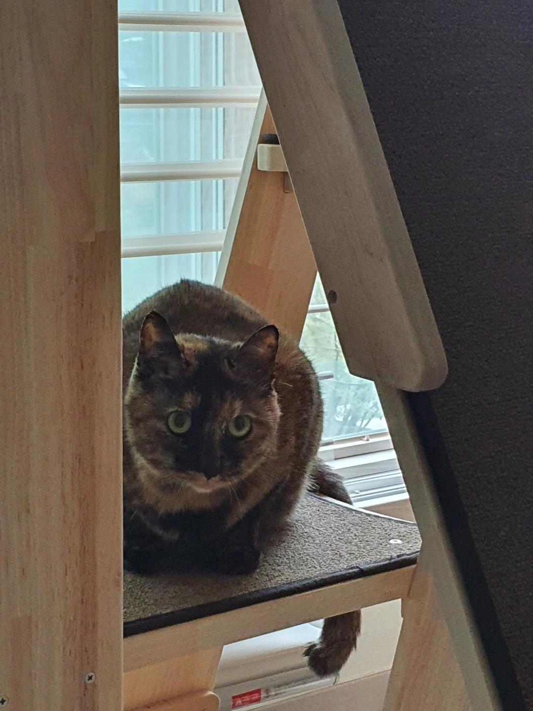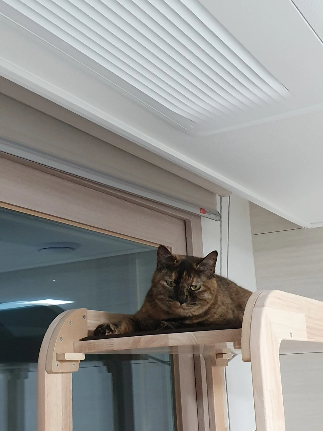 사람과 고양이가 내외하던 어느 날, 소파에 누워서 핸드폰을 하는데 야옹이가 거실로 나왔다. 벽을 따라 살금살금 걸으며 잔뜩 경계하면서도 걸음을 멈추진 않았다. 소파를 멀찍이 돌아서 창문 앞에 새로 마련한 캣타워로 올라가더니, 가장 높은 층에 배를 깔고 자리 잡았다. 그리고 나를 내려다보면서 한참을 주시했다.