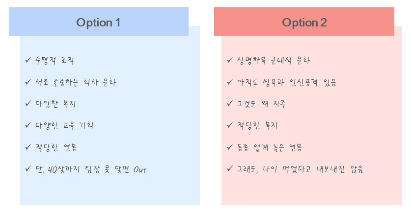 옵션 1과 옵션 2는 너무 극단적이다. 이 둘의 장점만 딱 갖춘, 완벽한 회사가 과연 존재할까? 그런 회사를 찾아서 3번의 이직을 했다. 사람은 경험한 만큼 성장한다고, 이직을 하면서 연봉과 처우가 좋아지긴 했다. 벌써 4번째 회사. 하지만 이곳이 완벽하게 좋은 회사인지는 잘 모르겠다.
