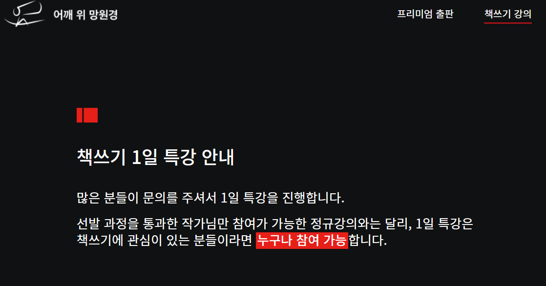종종 책 쓰기 혹은 글쓰기 특강을 찾아 듣는다. 브런치(블로그)를 하면서 독서와 글쓰기 게시물을 많이 열람해서인지, 인스타그램에 글쓰기 특강 광고가 자주 보였다. 보통은 저자 강연이 많지만 가끔 출판 관계자 강연이 열리기도 한다. 기왕 블로그를 시작했으니 기회가 된다면 내 이름으로 된 책으로 엮어보고 싶었다. 스스로 필력이 부족한 것을 알기에, 오랜 시간을 들여서 글쓰기 실력을 높이기보다는 출판사가 원하는 도서 컨셉에 맞춰서 글을 써내는 것이 더 빠를 것 같았다. 꼼수를 향한 불건전한 마음으로 출판 편집자 책 쓰기 특강을 신청했다.