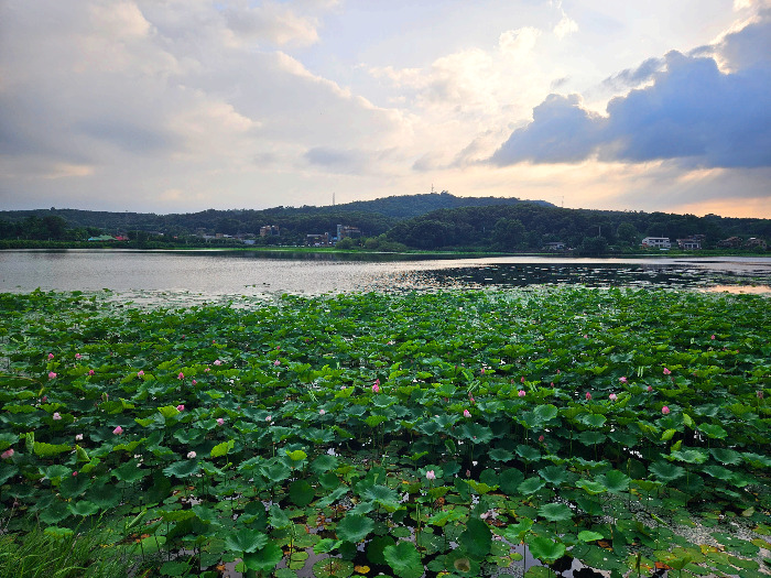 식사를 마친 뒤, 우리는 식당 옆 '보통저수지'로 이동했다. 짙은 파란색의 저수지 물 위로 연분홍빛 연꽃이 피어있었다. 진한 초록빛의 연닢들 사이로 분홍 꽃망울이 드문드문 보이는데, 저녁놀이 만드는 물빛의 반짝임과 어우러져서 동화같이 아름다웠다. 주말 저녁을 맞은 사람들의 여유로운 산책 걸음과 잘 어울리는 풍경이었다. 우리 가족도 신나서 그 풍경 속으로 들어갔다.