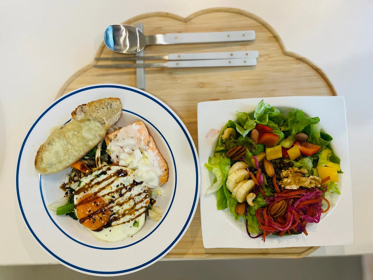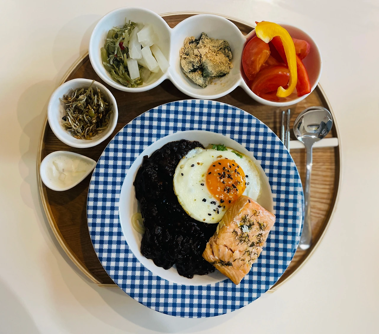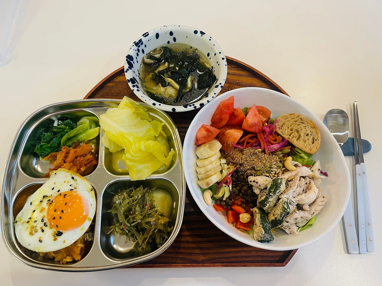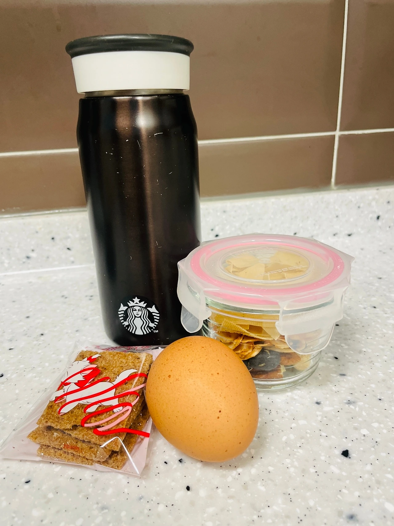 이건 첫찌 아침식단이고, 이와 비슷한 모양새? 의 두찌의 아침 식단에는 가루유산균과 학교 가면 금방 배고파진다길래 찐계란 1알을 더 추가했다.