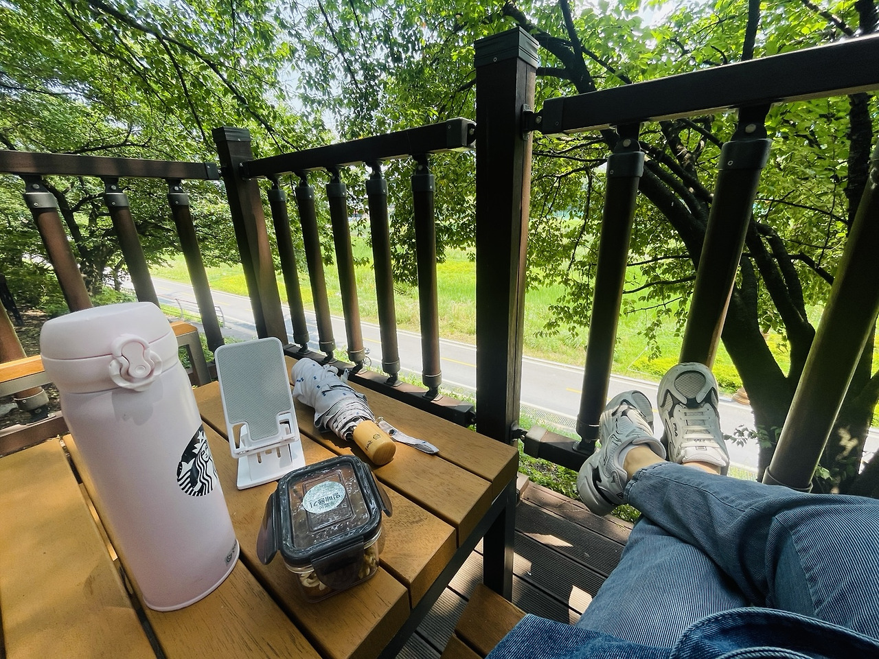 공방 맞은편 탄천에 피크닉장이 설치되어 있는데, 소수의 사람들이 작은 텐트도 치고 테이블과 함께 설치되어 있는 의자에 앉아서 간식 먹고 음료도 마시며 두런두런 즐길 수 있는 장소로 이용되고 있다. 바로 이 곳에서 나만의 힐링타임을 갖는다.