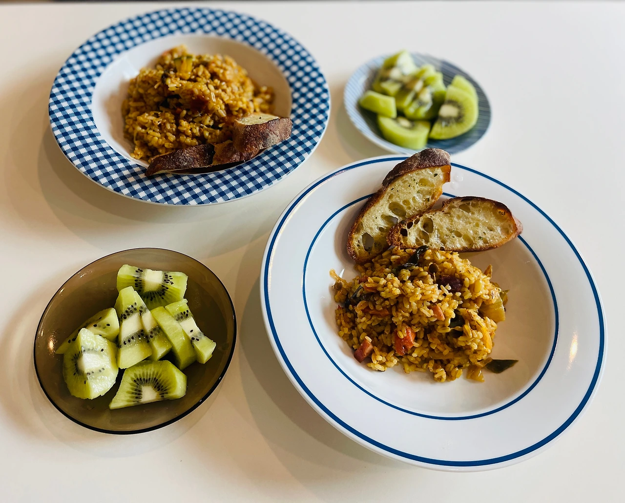 타르틴베이커리에서 구입한 바게트에 갈릭버터 바르고 토스터에 구워서 마늘바게트 만들어서 햄김치볶음밥에 살포시 얹고, 키위 하나씩 썰어서 비타민도 챙겨주기^^