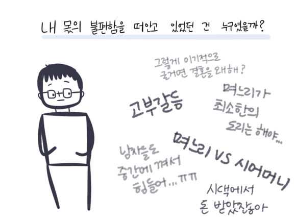 젠더 문제가 여성만의 문제가 아니듯, 시댁 문제 또한 시어머니와 며느리만의 문제가 아니다. 시댁이라는 젠더 문제에 있어 중요한 행위자는 시어머니와 며느리, 그리고 남편이다. 애초에 시댁 갈등은 남편이 제 역할을 하지 않기 때문에 발생하는 일이다. 여기서 '제 역할'이란, 우유부단한 중립이 아닌 자신의 부모에 대한 단호한 제재를 의미한다.
