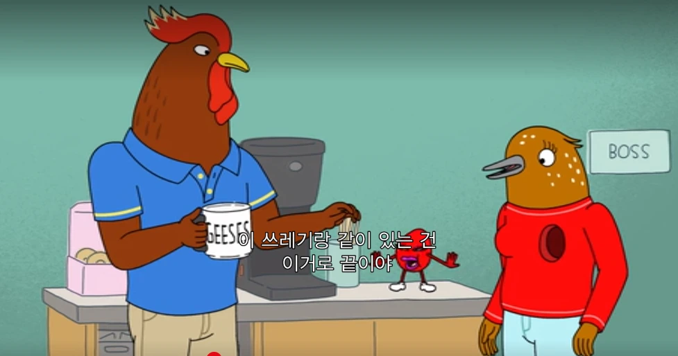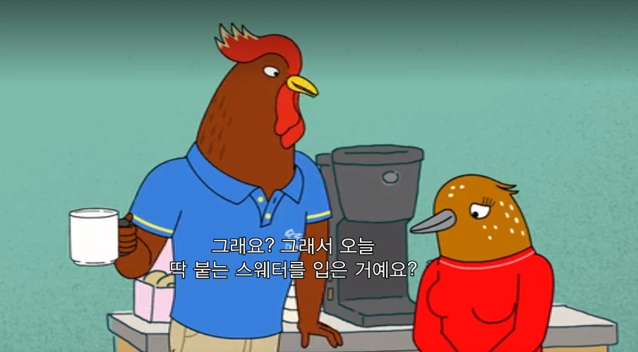 이 드라마는 가볍다. 그리고 재밌다. 저녁에 퇴근하고 피곤한 채로 넷플릭스를 켰을 때, 심각한 내용의 스릴러를 집중해서 보는 것도 필요할 때, 가볍게 핸드폰 만지며 보기 좋다. 시답잖은 코미디는 심슨의 그것과 같으나 페미니스트로서 불쾌한 내용은 없다. 시간도 30분 남짓. 인트로에 출렁이는 가슴의 모습은 자칫 성적 대상화된 여성의 몸에 대한 묘사가 아닐까 싶지만, 드라마를 계속해서 보다보면 알게 된다. 브라를 입지 않은 이것, 때로는 출렁이고 그래서 경쾌한 여성의 가슴을 보편적인 인간의 가슴으로 그렸다는 걸. 그래서 우리는 인트로에서부터 알 수 있다. 이 드라마에서 여성은 더이상 대상화된 존재가 아닌, 보편적인 인간이라는 걸 말이다.
