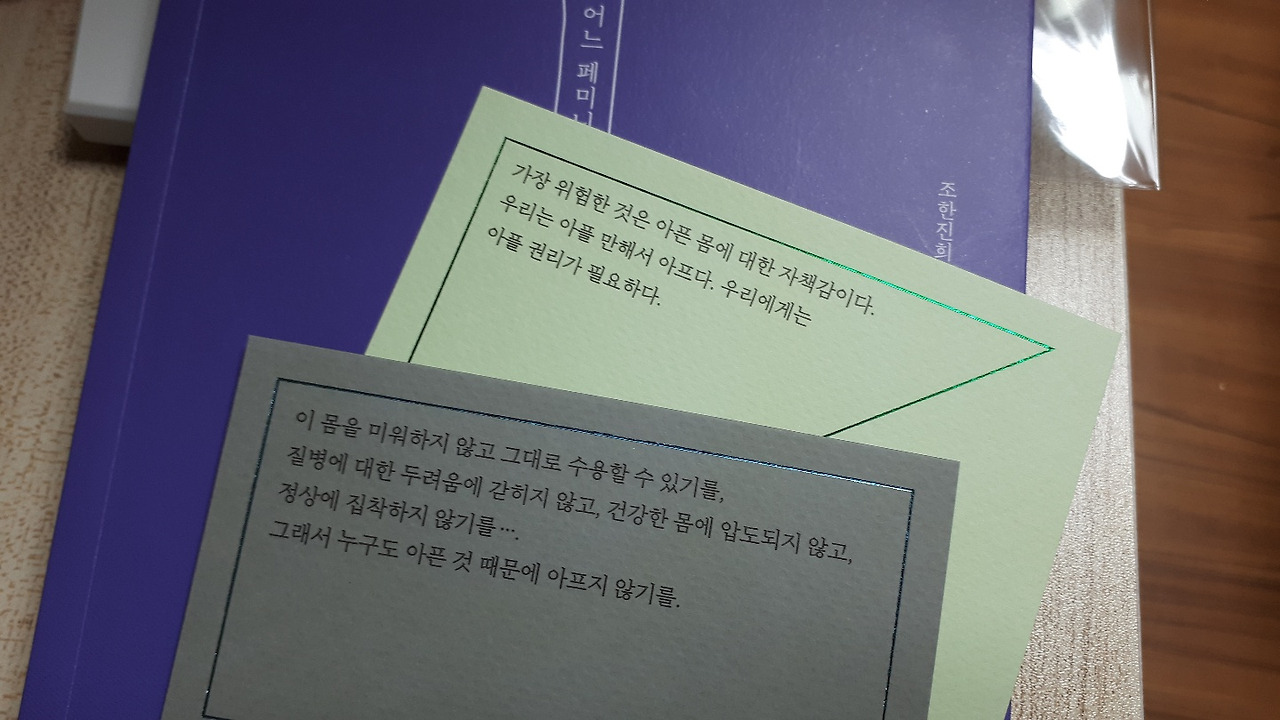 이 몸을 미워하지 않고 그대로 수용할 수 있기를. 질병에 대한 두려움에 갇히지 않고, 건강한 몸에 압도되지 않고, 정상에 집착하지 않기를... 그래서 누구도 아픈 것 때문에 아프지 않기를.