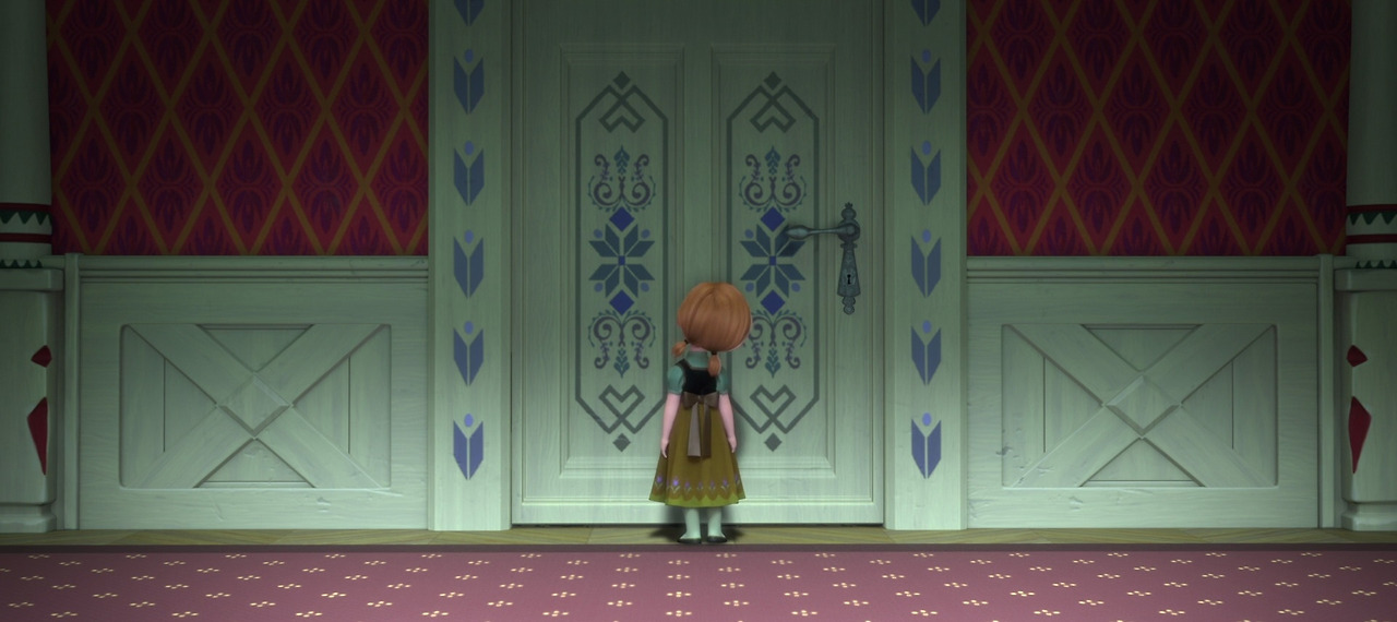 어린 안나는 영문도 모르고 닫힌 문 밖에서 늘 기다려야 했다. 아버지는 이유를 말해주지 않고 성문을 걸어 잠그었고 엘사와의 관계에서도 일방적으로 차단당했다. 엘사가 마법을 부려 함께 놀던 기억이 눈사람 만들며 노는 기억으로 바뀐 안나의 입장에서 당황스러운 상황일 수 밖에 없다. 어제까지만 해도 함께 눈사람 만들고 놀던 언니가 방문을 걸어 잠그고 만나주지 않으니까 말이다. 심지어 이런 상황은 몇 년 동안 지속된다. 사람을 귀찮아하던 사람도 사람이 고플 지경일 것이다. 그래서인지 안나는 처음 만나는 사람에게도 쉽게 마음을 문을 여는 사람으로 성장한다.