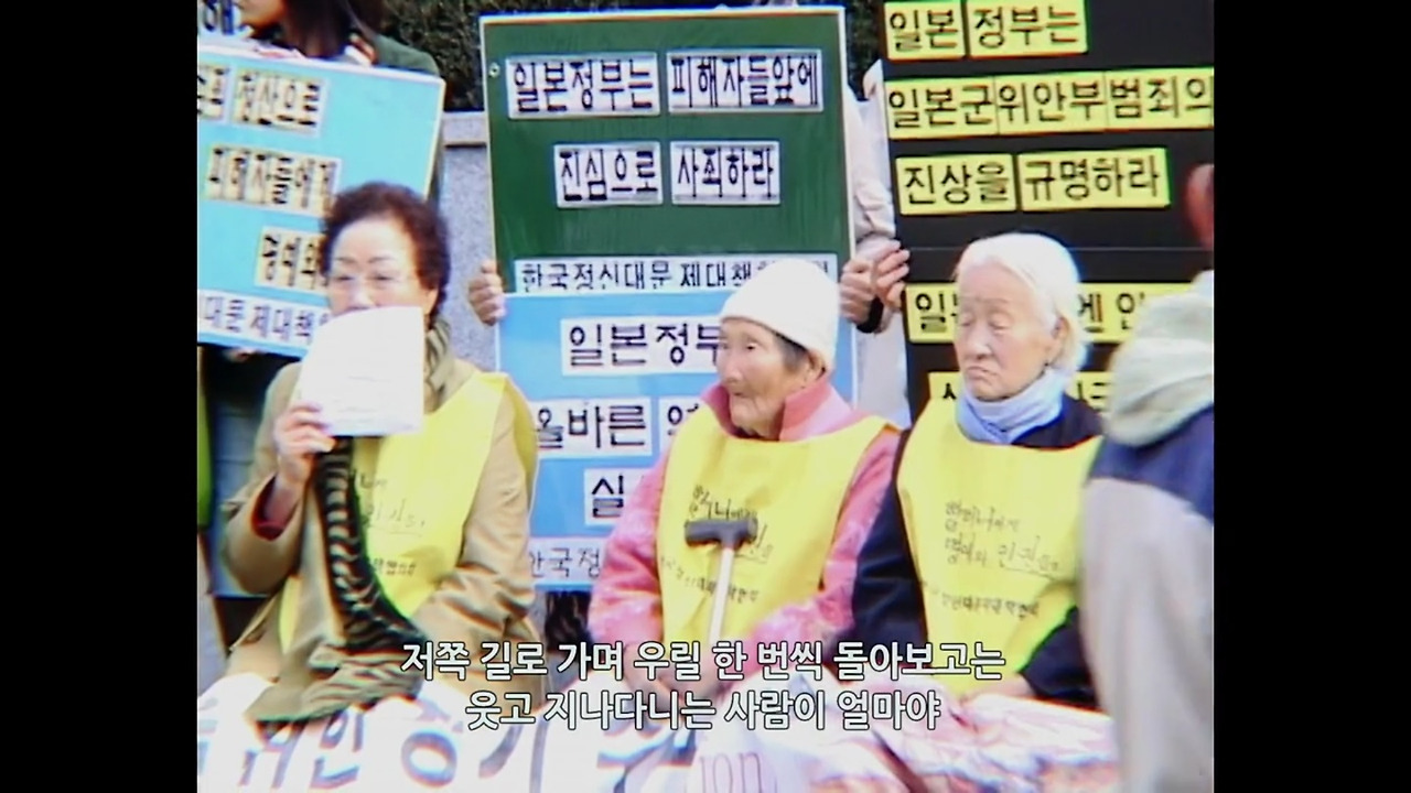 지금은 그래도 일본군 '위안부' 문제에 대한 영화도 있고 전 국민의 공감과 지지를 받는 문제로서 공론화되었지만, 할머니들이 한창 거리에서 운동을 하시던 90년대와 2000년대는 지금보다 훨씬 열악했다. 일본 대사관 앞에서 매주 열리는 수요집회엔 열명 남짓한 소수의 인원들이 모였을 뿐이고, 지나가던 행인들도 공감은커녕 낯설게 바라보고 지나칠 뿐이었다. 이에 이옥선 할머니는 그때 지나가던 사람들의 비웃음이 아팠다고 고백하신다.
