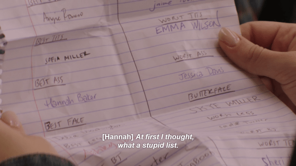 해나의 친한 친구였던 알렉스는 잘나가는 남자아이들의 무리에 편입되기 위해, 섹시한 엉덩이(hot ass) 1위로 해나를 지목한다. 해나는 성적 대상으로 지목되어 성희롱의 대상이 되고, 알렉스는 그 과정을 통해 성공적으로 잘나가는 남자아이들의 무리에 편입된다. 남성적이지 못한 남성이, 남성 위계의 하층에 위치한 남성이 여성을 성적으로 조롱하고 비하하는 '놀이'를 공유하는 것을 통해 남성사회에 진입하는 과정이 잘 드러났다.
