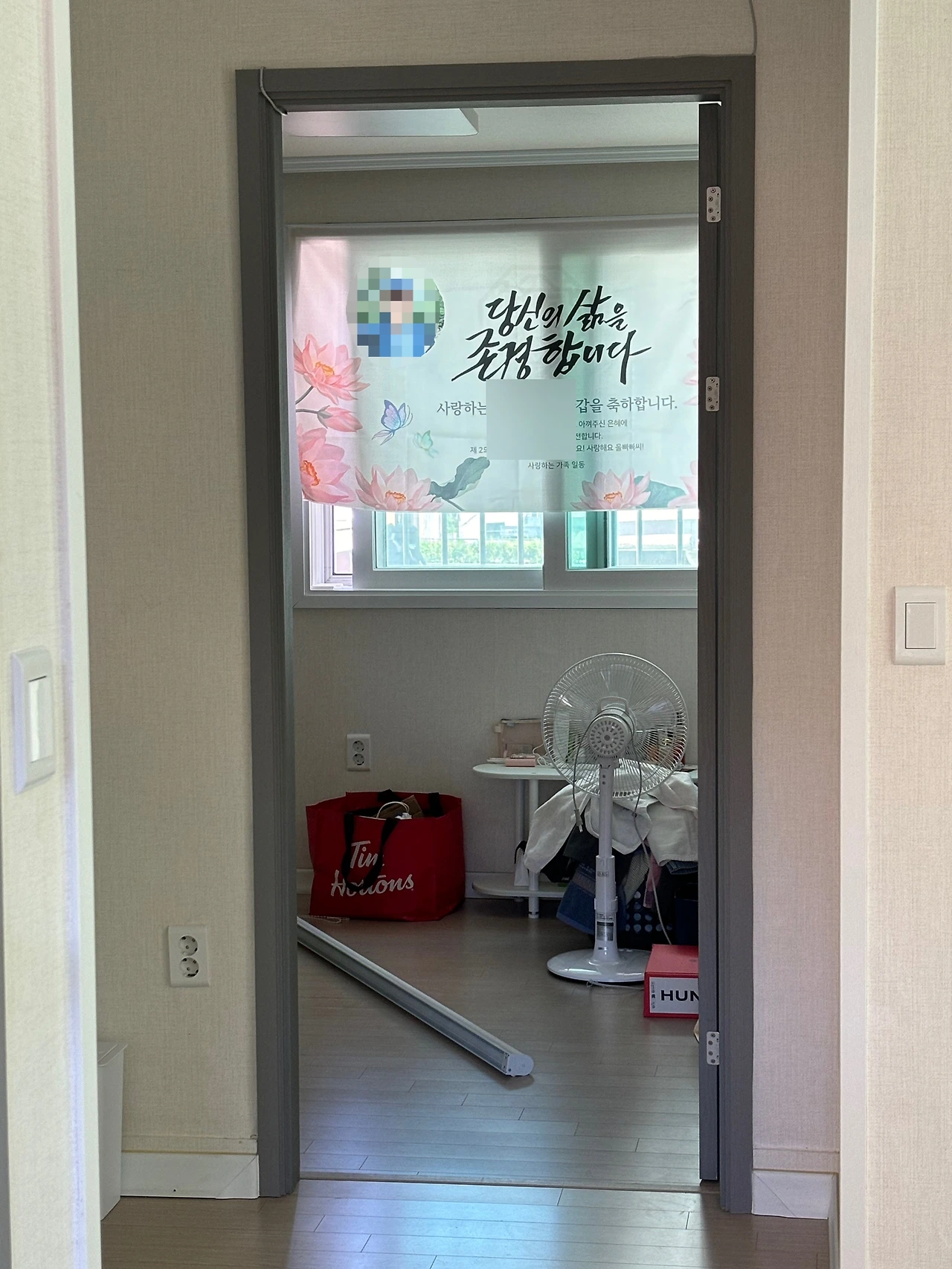 나의 얼렁뚱땅 성격..커튼이 없어서 대충 아빠의 환갑축하 현수막으로 창문을 가렸다. 사이즈가 아주 딱 맞아서 만족스러웠는데, 네로는 이사와서 이걸 첨보고 빵 터졌다.