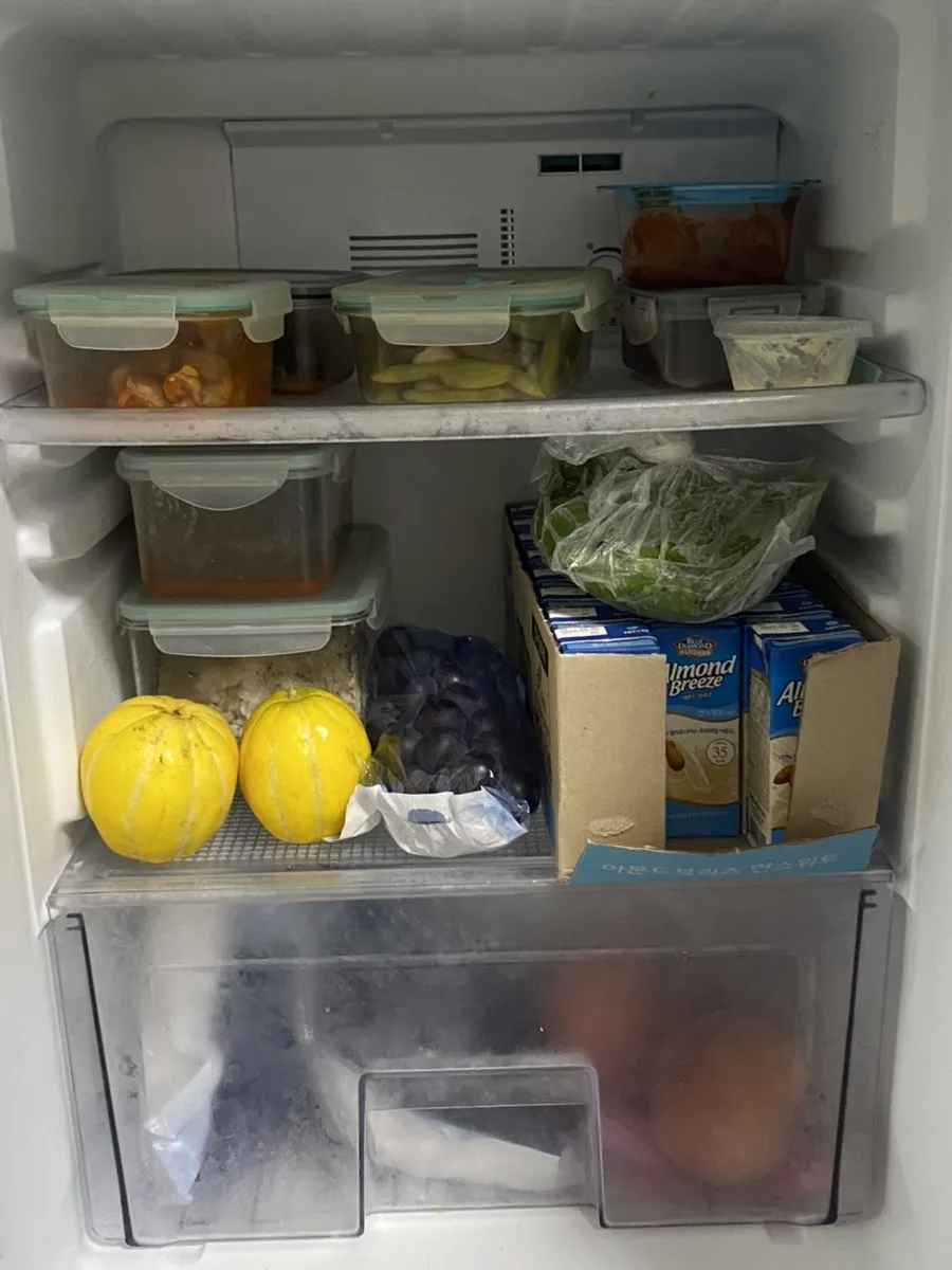 친구랑 둘이 동거하면서 당연히 원룸 살 때 보다 집 크기가 커졌다. 덩달아 냉장고 크기도 커졌다. 나의 부모님은 냉장고 크기가 커진 것을 제일 반기셨다. 그동안에는 냉장고가 작아서(시원찮아서) 뭘 보내줘도 이게 다 들어갈까 걱정하셨지만, 이제는 양껏 넣을 수 있다. 또 친구랑 싸우지 말고 같이 맛있게 먹으라며 반찬의 양도 두 배로 늘었다. 서른 넘은 딸이어도 엄마 눈엔 아직도 응애~ 베이뷔 인가보다. 엄마가 보내주신 밥과 반찬, 어떨 땐 국까지 가득 찬 냉장고 문을 열기만 해도 배가 부르다.