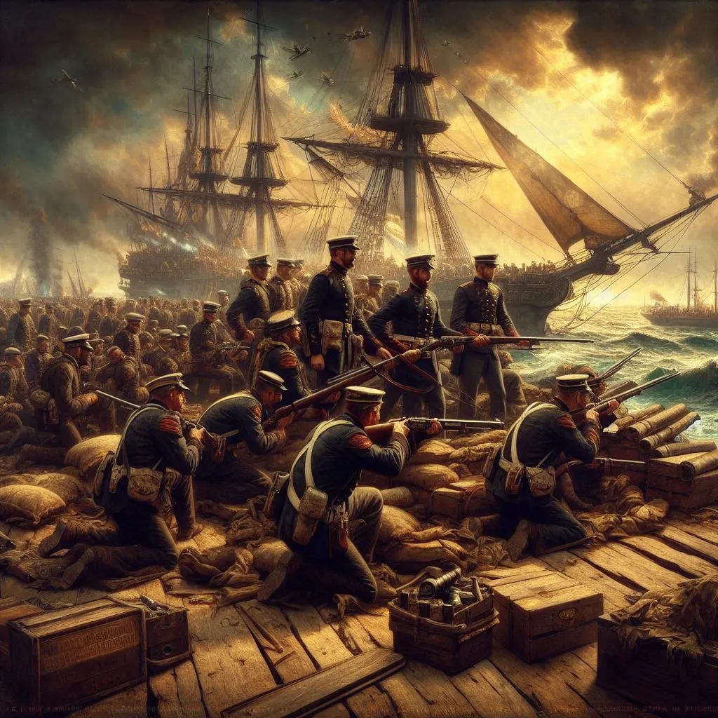 해는 어느덧 낮게 지면서 하늘이 피와 불의 색으로 물들고 있었다. 그 순간 스페인 함선으로부터 함포 한 발이 배의 선미 옆 바다로 위협포격이 시작되었다. 데이비스 제독은 순간 스페인 함선으로부터의 공격이 다른 의미가 있다는 것을 간파했다.한 발의 포성과 다시 이어지는 긴 정적은 오히려 병사들을 정신적으로 힘들게 하였다.