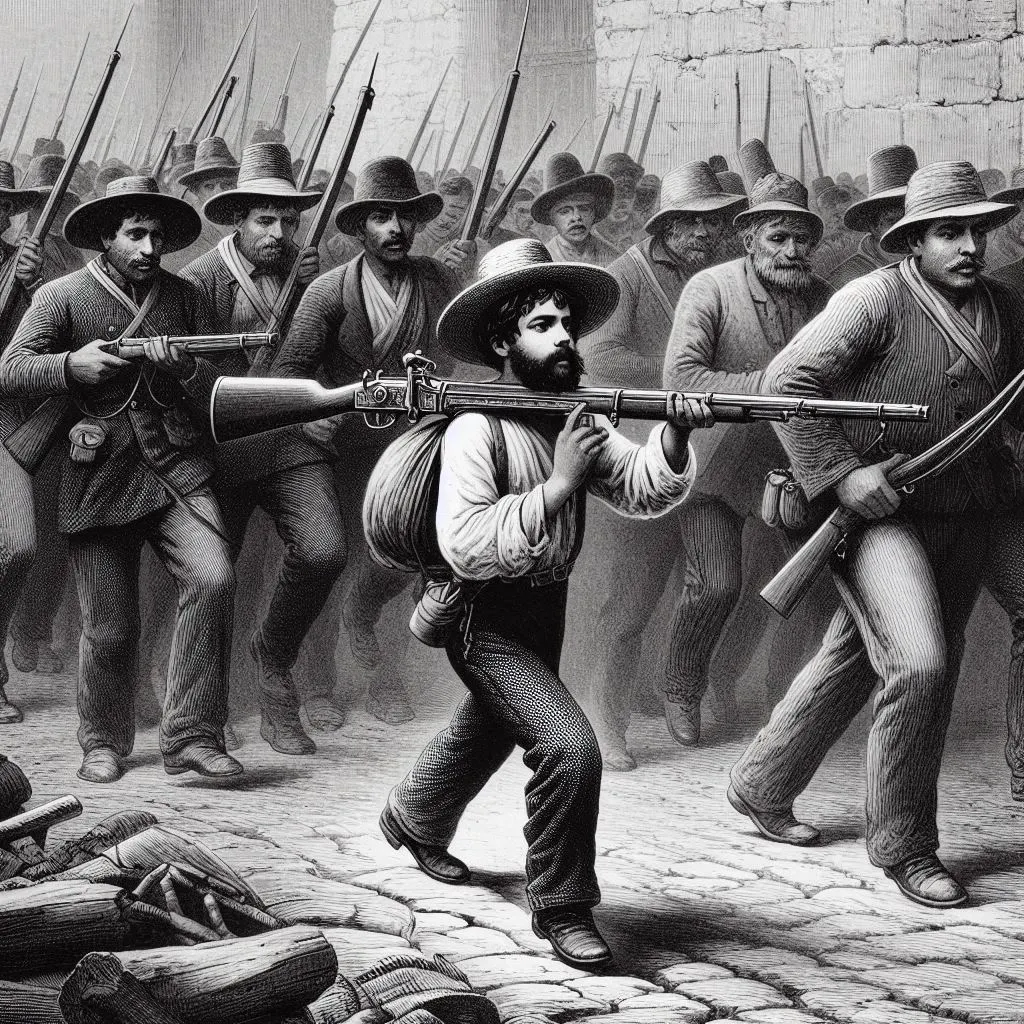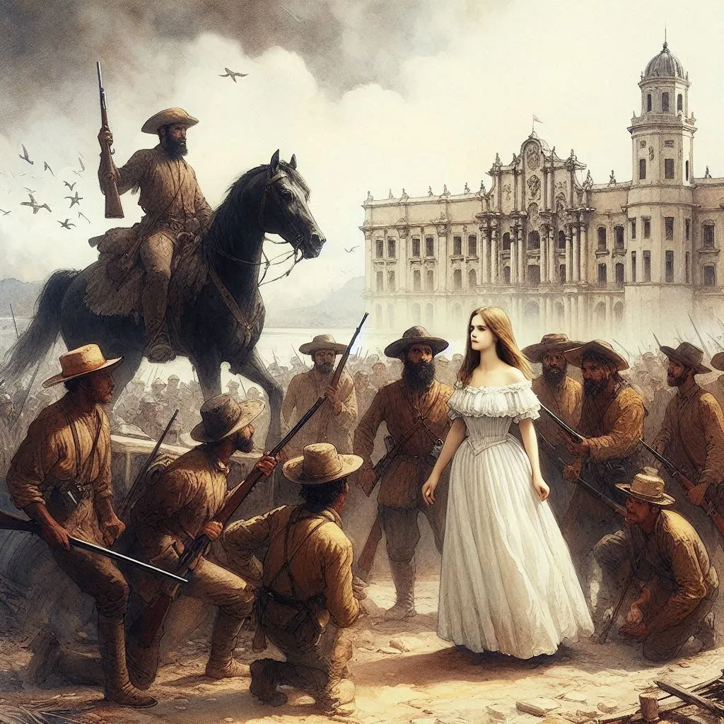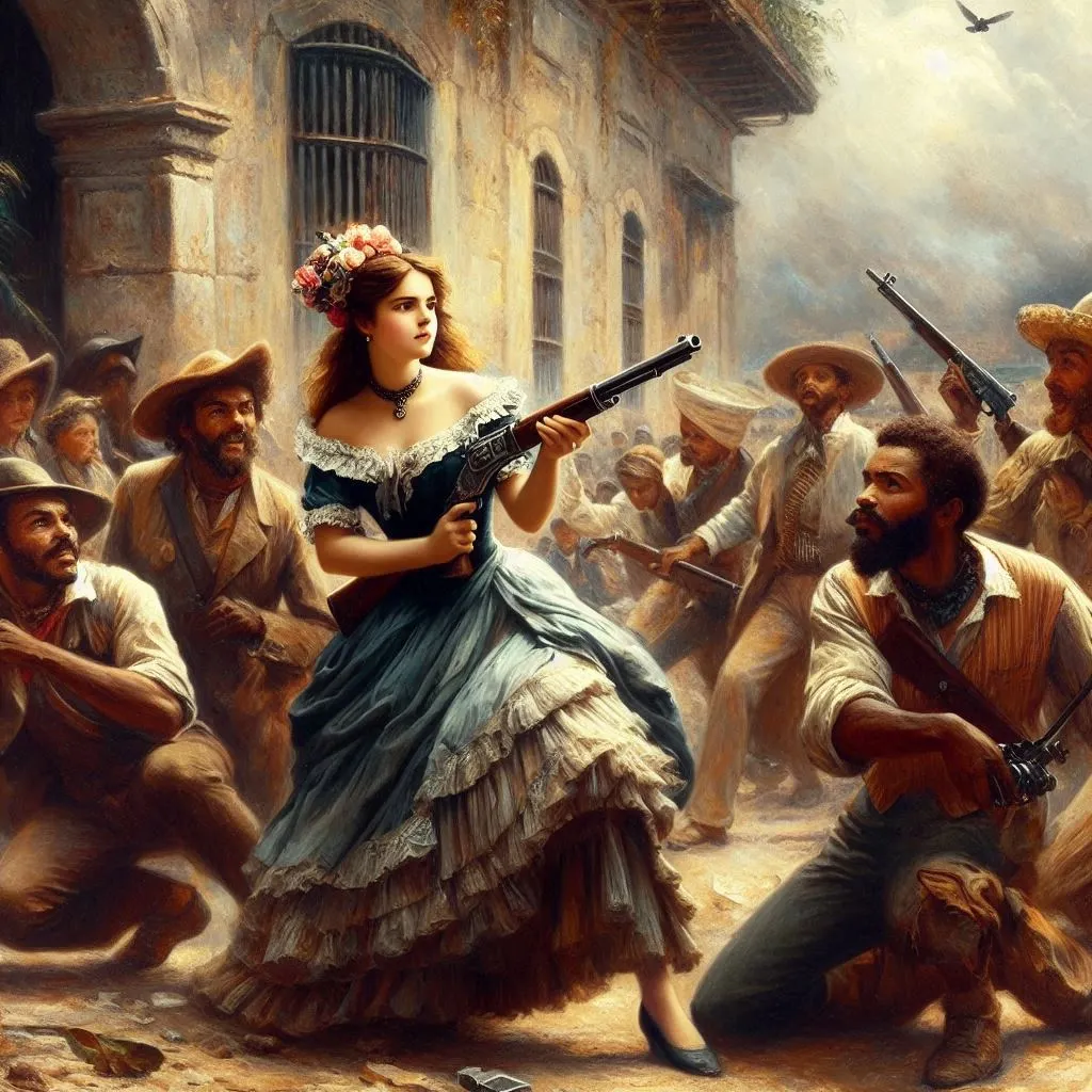 교회 부서진 외벽에는 부상병들을 보살피던 한 귀족 부인이 저항군에 둘러싸여 두려움에 떨며 도망치지도 못하고 육 연발 권총을 손에 쥔 체 저항군들을 노려 보고 있었다.