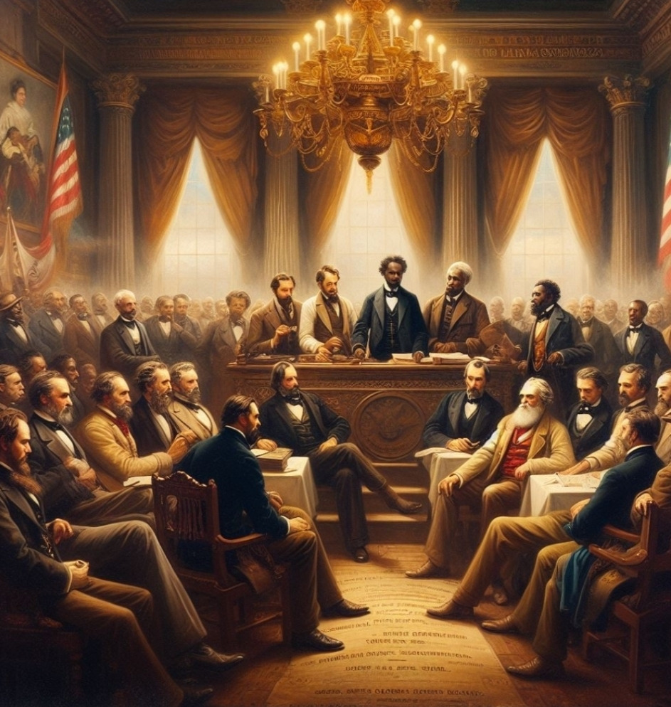 출처: 마이크로 빙 AI로 그린 1860년대 초반 미의회에서 노예제로 의견이 갈리는 것을 형상화 하였다.