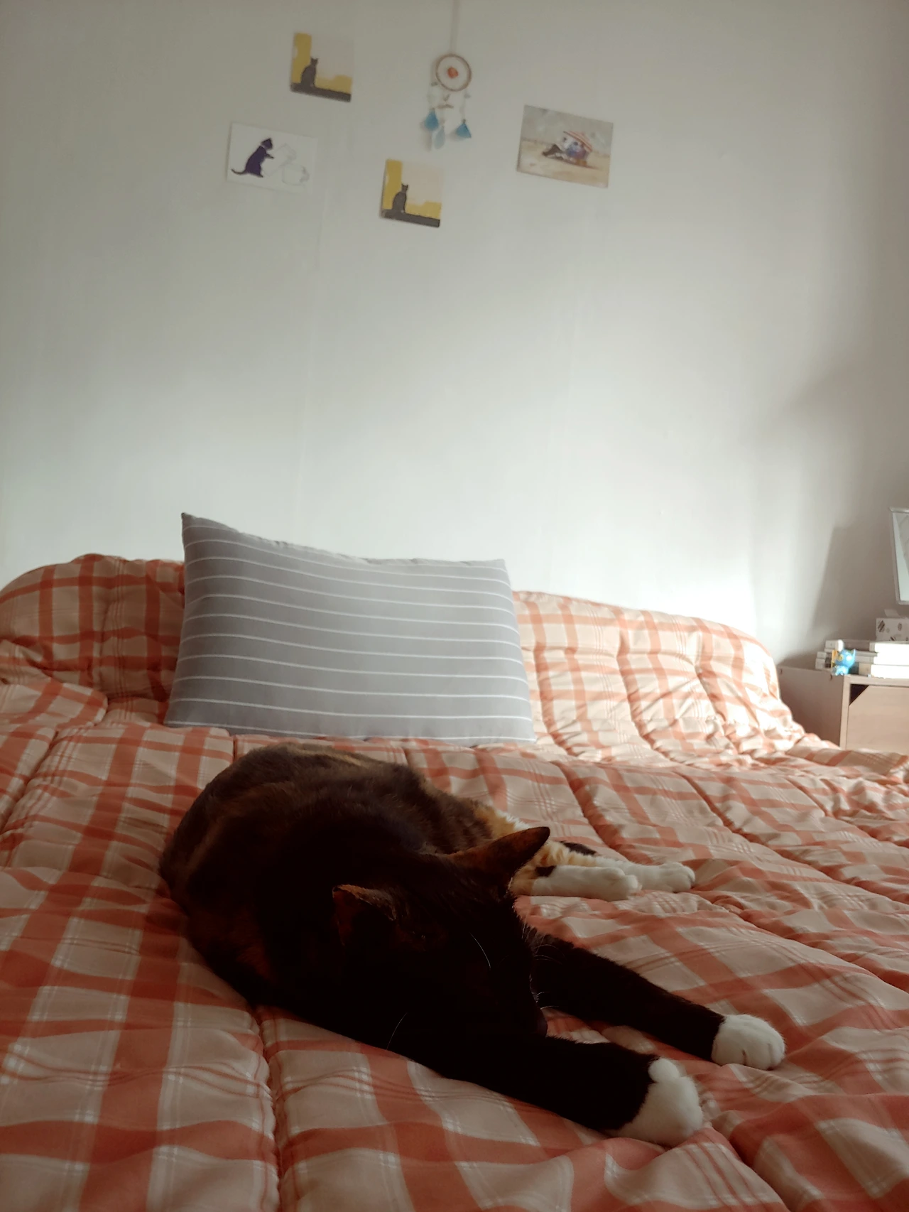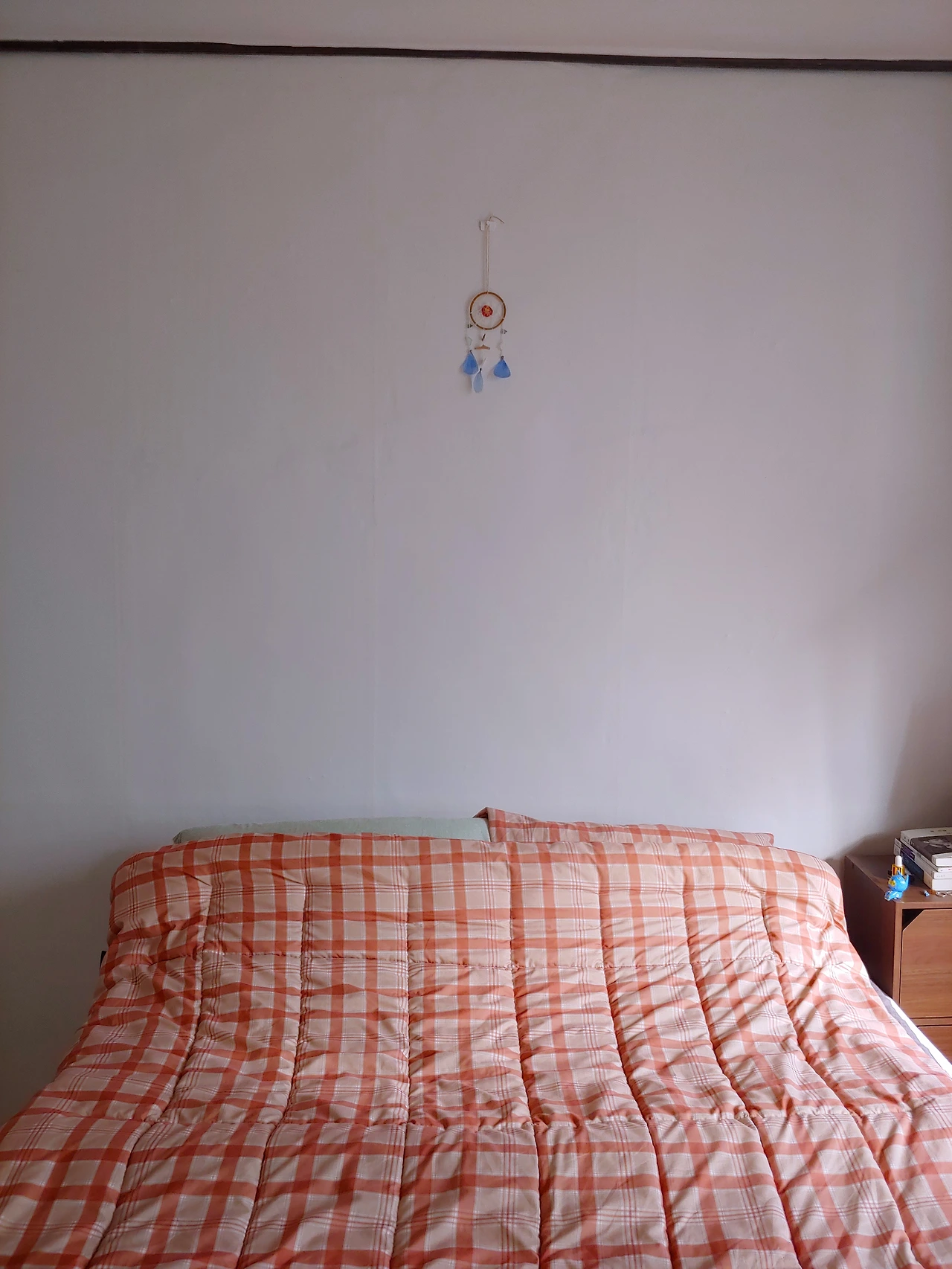 나는 당시에 스페인에 가기 위해 소비 자체를 안하고 있었지만 이건 스페인까지 들고 갈 수도 있을 것 같았다.(실제로도 그렇게 했다.) 이사 와서 자리를 잡지 못하고 달력 위에 대충 걸려있던 걸 다시 붙일 생각으로 신중히 잡은 위치에 꼭꼬핀을 꽂았다. 침대 위 좌우 대칭이 맞는지 확인하며 드림캐쳐를 걸었다. 하얀 벽이 너무 커서 그런지 드림캐쳐가 유난히 더 작아보였다.