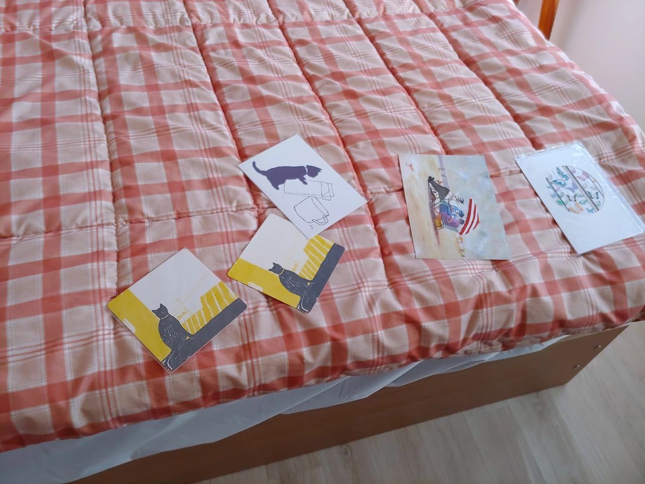 그 주변으로 엽서를 어울리게 붙여보았다. 대만 고양이 엽서 세 장으로는 모자라서 미술관에 갔을 때 가져왔던 엽서도 한 장 달았다. 균형이 맞아 기분이 좋아졌다.