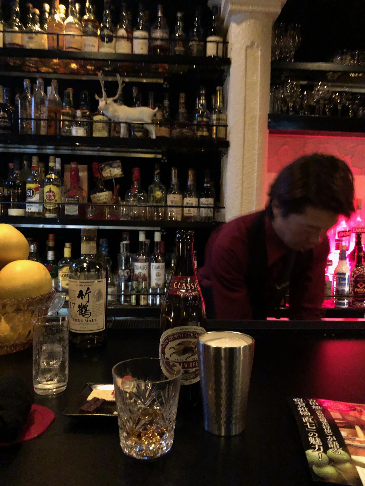 밤 7시가 지나면 별빛 외 아무것도 보이지 않는 마을에서 며칠을 보낸 뒤, 오랜만에 인구 5만 정도의 도시에 들어오니 편의점도 쉽게 찾을 수 있고, 일본 위스키를 파는 술집도 기웃거리게 된다. 내가 간 술집은 화이트하우스라는 곳이다. 답답한 마음에 이 술집에 들어왔고, 주섬주섬 주머니를 뒤져 6,000엔을 내놓고, 이게 전부니 알아서 스탑해달라고 요구했다. 바텐더가 붉은색 조끼에 검은 나비넥타이를 매고, 기무렛에 고치현 특산 과일을 넣어달라는 나의 요구도 나오시치를 넣어 척척 만들어주고, 옆테이블에 유치해 보이는 칵테일을 서빙하길래 뭔지 물어보니 초콜렛 마티니라고 답하며 자신도 알기 어렵다는 듯 고개를 살짝 절래절래 젓는 것도 마음에 들었다.