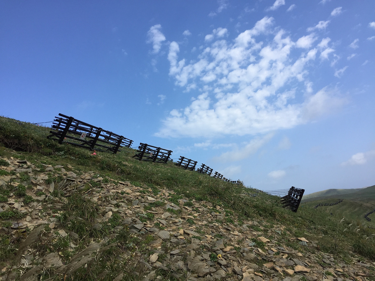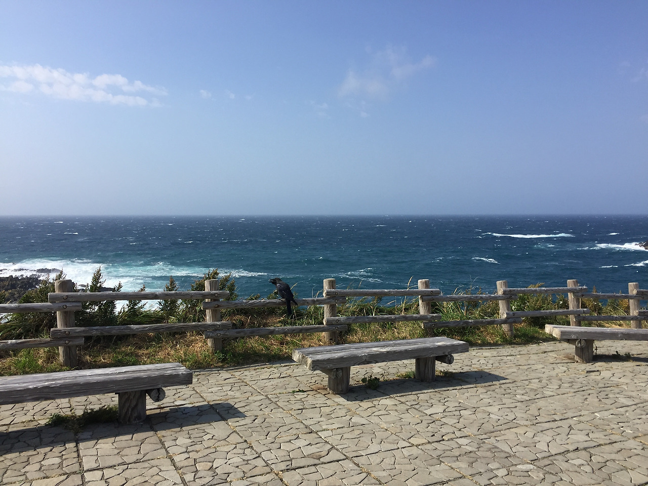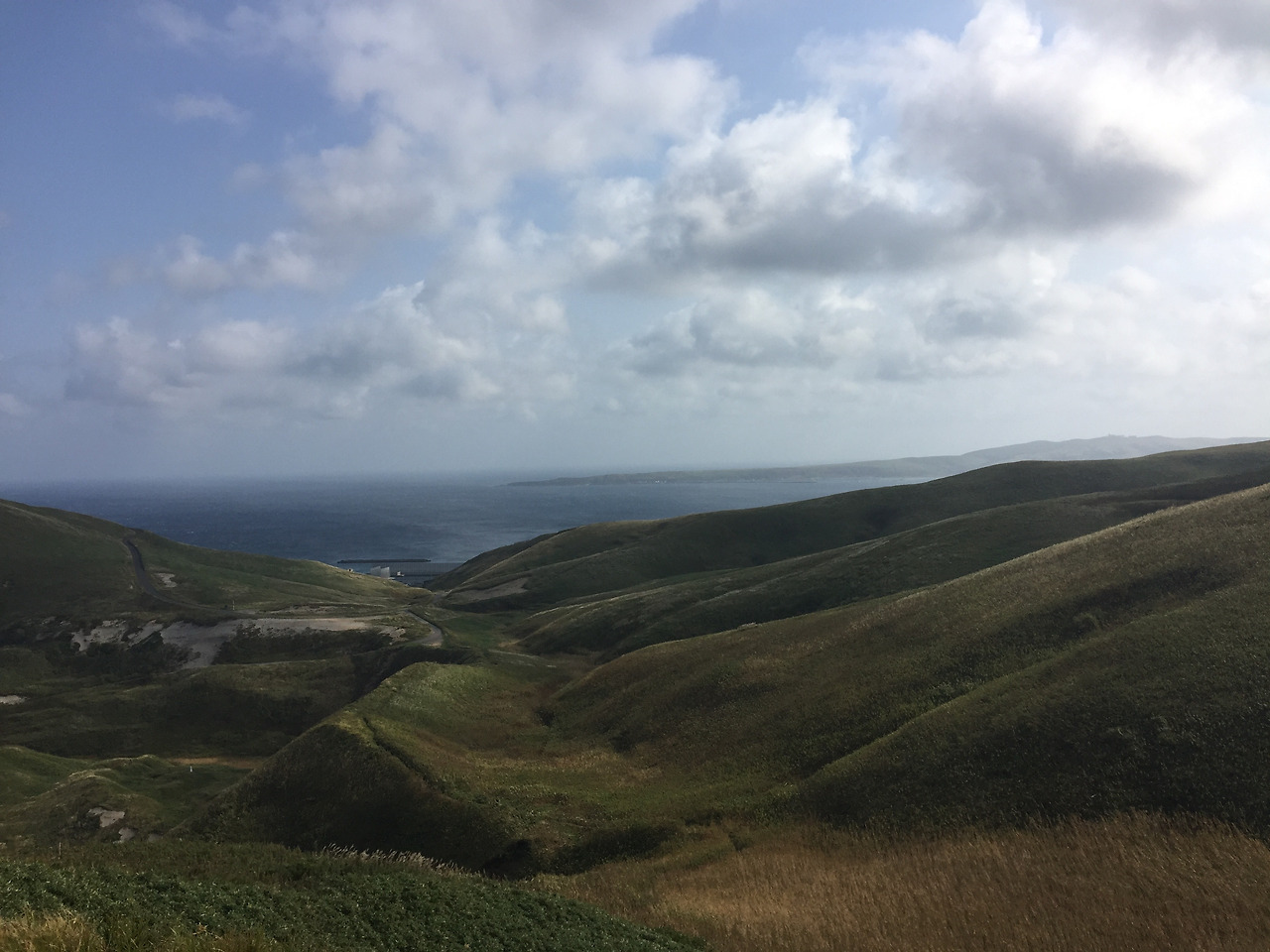 수카이 곶까지 가는 길은 좀 더 평이하고, 매점도 하나 있고, 벤치도 몇 개 있다. 좀전까지는 세상의 끝이었던 분위기에서 약간은 급작스럽다고 할만한 변화다. 그래도 따뜻한 캔커피를 마실수 있고, 가지고 온 도시락도 편하게 먹을 수 있다. 도시락은 그 내용물이 뭐든 간에, 땅바닥에 앉아 먹는것보다 의자에 앉아 먹는게 좋다는게 내 생각이다. 여기서부터 버스정류장까지 가는 길은 도로 옆에 붙은 인도를 따라가는 것인데, 뒤돌아보면 언덕 사이로 바다가 보인다는 것 말고는 평이한 길이다. 지루할 수 있는 길이지만, 안락하다는 기분이 더 컸다. 자전거를 탄 모자 말고는 아무도 만나지 않고 코스 끝 하마나카 마을에 도착한다.
