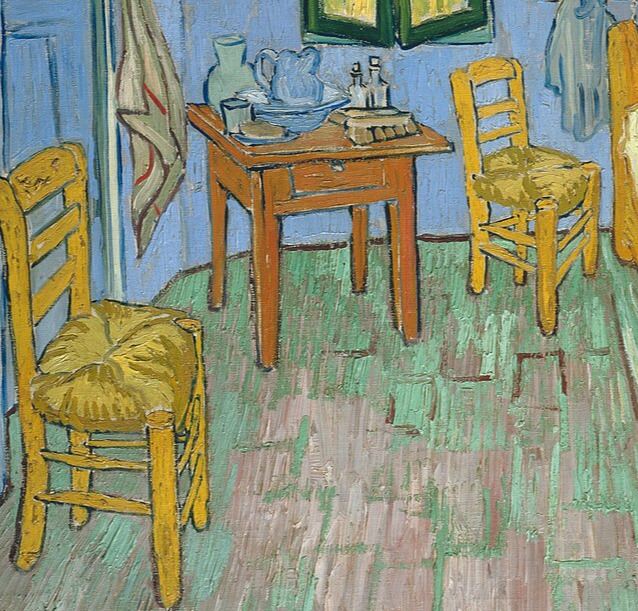 반 고흐: (온화하게 웃으며) 네. 마음에 있는 이야기를 털어놓은 사이라 그런지 친근한 느낌이 드는군요. 그려진 방은 제 침실입니다. 아를에서 머물던 집의 2층 방이지요. 총 4개의 방을 빌려서 사용하고 있었습니다. 1층의 두 방은 아틀리에와 주방으로 사용했고, 2층의 작은 두 방은 침실과 손님을 위한 방으로 사용했죠. 손님방에는 제 친구 고갱이 9주 동안 머물렀습니다. 왼편의 분홍색 차양막이 있는 건물은 식당인데 제가 즐겨 찾던 곳이죠.