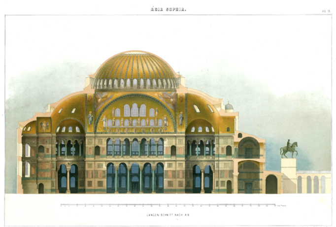 아야 소피아는 532년에서 537년 사이에 지어진 건물로 로마의 판테온의 '돔구조'를 떠올리면 구조적으로 어떠한 창의성이 발휘되었는지 알 수 있다. 이 건물을 만들기 위해서 건축가는 새로운 구조체를 상상해야 했다. 단순히 돔의 크기를 키우지 않고 높은 무주 공간을 만드는 요구를 받고 그는 아랫단을 사각형의 평면으로 쌓고 그 위에 반구형의 구조체를 올린 다음 반구형의 네 면을 잘라내고 거기에 사 반구를 붙였다. 그리고 가운데 반구의 윗부분을 도려내고 도려낸 단면의 지름을 갖는 반구를 쌓아 올리면 새로운 구조체인 '펜덴티브' (pendentive)가 완성된다.