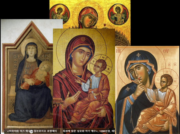 일련의 성모와 아기예수의 그림들을 보면 공통된 도식이 보인다. 왼편의 마리아와 오른편의 아기예수, 마리아는 아기예수를 안고 있을 것, 두 인물의 뒤편에는 님부스를 그릴 것. 고대 이집트의 미술과 같이 이 시기의 미술가들은 일종의 공식화된 표현들을 만들어 내었다.