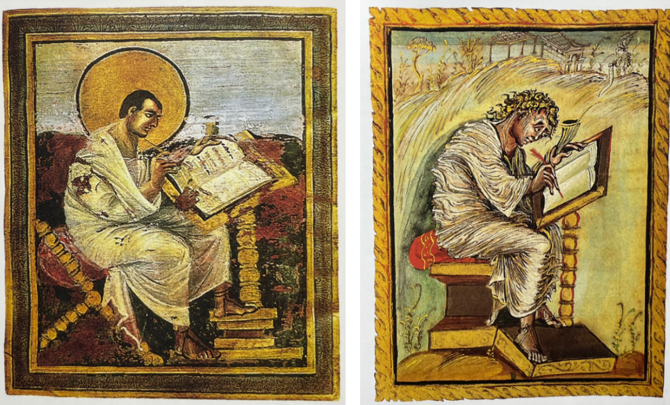 왼편의 필사본을 그린 미술가는 성 마태오의 정적인 부분을 강조하려 한 듯하다. 학자로서의 성 마태오를 표현하기에 침착하고 고요한 마음으로 신의 음성을 이성적 활동으로 써 내려가는 듯하다. 반면 오른편의 그림은 성 마테오가 신의 영감을 받은 종교적 열정을 무아의 상태에서 써내려 감을 강조하려는 듯하다. 두 그림에서 중세의 미술가의 각기 다른 성 마태오에 대한 해석을 볼 수 있다. 이를 통해 우리는 신에 대한 믿음이 그가 우리에게 준 이성적 사고를 통해 도달할 수 있는 것인지, 열의와 환희에 의해 가능한 것인지 고민해 볼 수 있다.