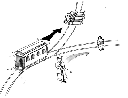 영국의 철학자 필리파 풋(Philippa Ruth Foot, 1920-2010)이 제시한 이 모델은 광산을 이동하는 차(trolley)의 선로를 바꾸는 것으로 피해자의 숫자가 달라진다면 우리는 어떤 행동을 하겠느냐는 윤리적 질문을 다룬다. 공리주의적 해석을 위한 예로 많이 쓰이는 이 질문에 대다수의 사람들은 다수를 구하는 쪽으로 선택을 해야 한다는 답을 한다. 사람의 목숨을 숫자로 세기 때문이다. 하지만 이것은 모델일 뿐 실제는 그와 다르다. 만약 소수의 희생자가 있는 쪽에 자신의 지인, 가족, 친구가 있다면 과연 다수를 구하는 선택을 할 수 있을까? 만약 다수의 희생자가 범죄자나 살인범들이라면? 이렇게 대상에 대한 약간의 구체성만 들어가도 우리의 판단은 양적 공리주의로 판단하기 어려운 것으로 변한다.