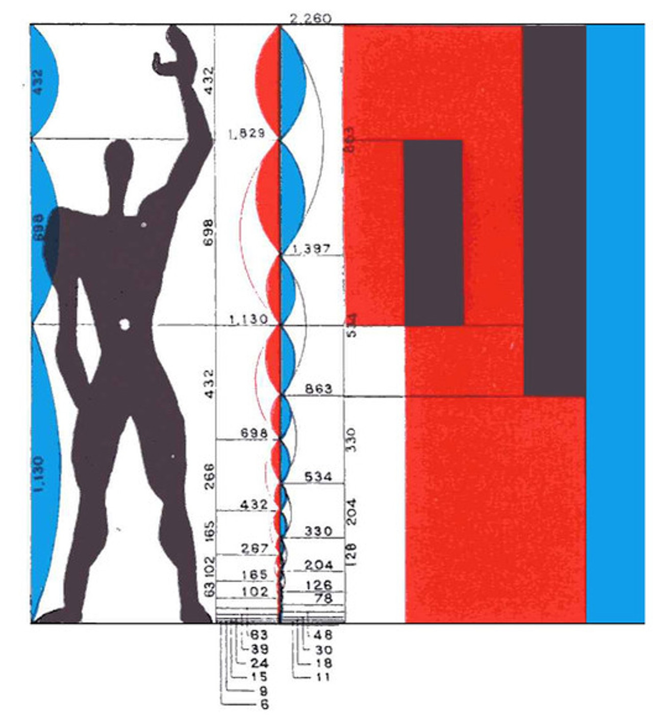 왼편의 <비트루비우스적 인간>은 인간의 보편성을 기하학적 질서로 이해했음을 보여주고 있고 인간은 대우주와의 연결되어 있음을 증명한다. 오른편의 르꼬르뷔지에의 <모둘라>는 평균적 인간의 스케일을 기준으로 모든 건축적 스케일을 결정한다는 것을 보여준다. 이 둘 모두 개별 인간에 대한 구체적인 이해보다 객관적, 보편적 인간에 대한 전제를 기반으로 한다. 물론 개별적 인간에 맞는 개별적 미술을 하는 것은 막대한 자원과 시간을 요구한다. 효율성, 가성비의 근대성은 이집트의 객관적 미와 그리스인이 발견한 이성적 능력의 결과물임을 부정할 수 없다.