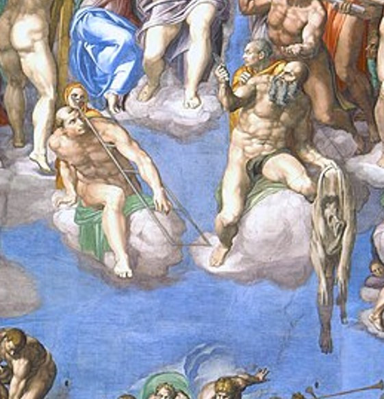 최후의 심판의 가운데 부분에 위치한 사다리를 들고 있는 인물과 사람가죽을 들고 있는 인물들은 꼬인 상하체의 움직임을 통해 획일적인 자세에서 쉽게 벗어날 수 있었다.