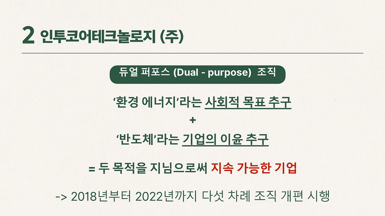 김나정. (2024.04.22). 듀얼퍼포스 기업의 조직구조 및 인력 관리 딜레마–인투코어테크놀로지. 아산 기업가정신 리뷰.