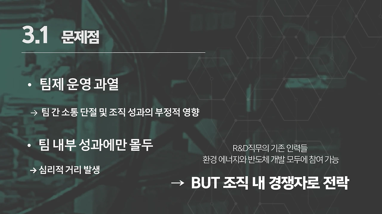 두 사업을 하나의 구조에 담으려는 시도는 팀 단위 재배치, 권한 조정, 협업 절차 개선 등 여러 실험을 낳았다. 하지만 전략–조직–직무가 총체적으로 정렬되지 않은 상태에서 조직 구조만 바꾸는 방식은 오히려 반도체 vs 환경에너지 팀 구성원 간 대립을 고착시키는 방향으로 작용했다.