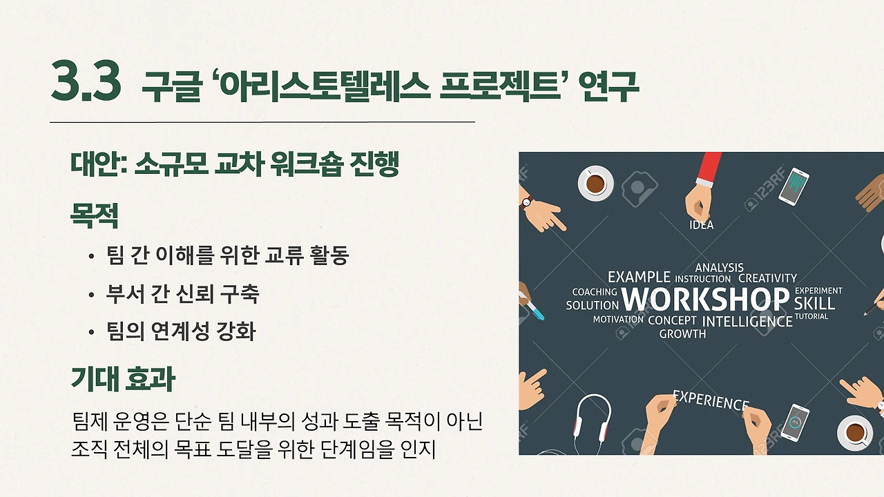협업의 구조가 다시 설계되더라도, 구성원들이 서로를 신뢰하지 않는다면 이 구조는 작동하지 않는다. 이 지점에서 구글의 아리스토텔레스 프로젝트가 제시한 핵심 메시지—팀 성과의 가장 중요한 요인은 심리적 안전(psychological safety)이다—는 인투코어가 반드시 참고해야 할 지점이다. 하지만 중소기업의 현실에서 갑작스러운 전사(全社) 규모의 문화 변화나 폭넓은 워크숍을 도입하는 것은 오히려 부담을 줄 수 있다. 인투코어에 필요한 접근은 더 작고, 더 촘촘하며, 더 일상적인 교류 방식이다. 이를 위해 적절한 방식은 소규모 교차 워크숍(micro cross-team workshop)이다.