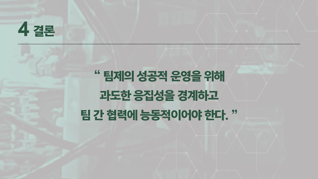 조직이 빠르게 확장되면서 팀 중심 체계가 강화됐다. 문제는 이 응집성이 직무 기반 협력으로 이어지지 않고, 오히려 팀 내부 폐쇄성으로 변질된 점이다. 팀의 내부 구성원끼리는 끈끈했지만 다른 팀 구성원과의 연결은 약해지고 조직 전체를 바라보기보다 팀 중심 사고가 강화됐다. 결과적으로 반도체 부문과 환경에너지 부분 간에 “우리 팀만 고생한다”는 인식이 양쪽에서 동시에 나타났다.