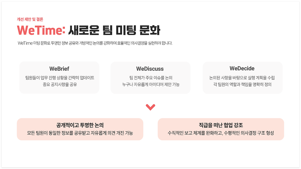 위워크의 의사결정 구조는 창업자 개인의 직감에 지나치게 의존한 수직적 시스템이었다. 이로 인해 구성원은 전략적 판단의 주체가 아닌 단순한 ‘보고자’로 머무를 수밖에 없었다. 그러나 진정한 ‘We’를 실현하려면, 구성원 모두가 정보에 접근하고, 의견을 내며, 실행에 참여할 수 있는 수평적 협업 구조가 필요하다. 이를 위한 새로운 대안이 바로 WeTime이다. WeTime은 단순한 회의 방식을 넘어, 정보 공유, 논의, 실행 계획 수립을 수직이 아닌 수평적 구조로 전환하는 협업 프로세스다.