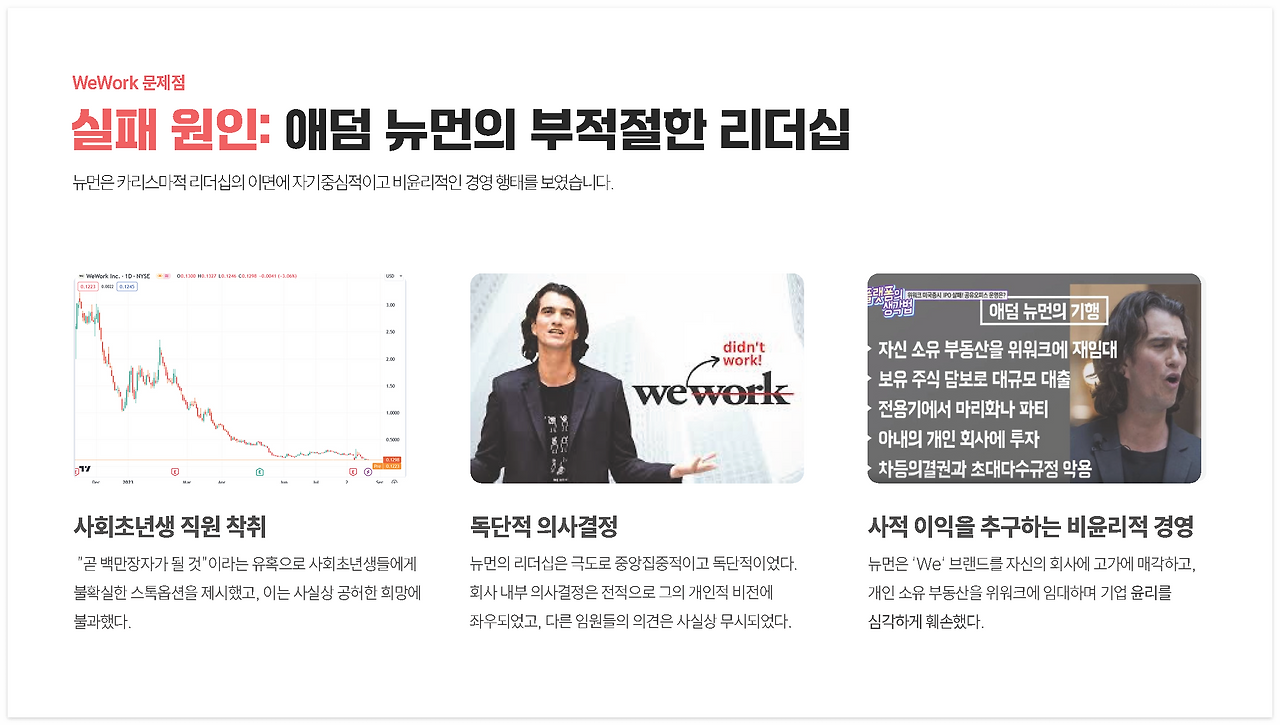 이와 더불어, 그는 개인 소유의 부동산을 위워크에 고가로 임대하거나, 'We'라는 상표를 본인 명의로 등록한 후 이를 회사에 판매하는 등 이해충돌적인 행위를 반복했다. 이러한 행동은 단순한 경영 실패를 넘어, 리더의 도덕성과 기업 거버넌스 전반에 심각한 훼손을 야기했다. 결과적으로 애덤 뉴먼의 리더십은 기업의 장기 생존 가능성을 저해한 핵심 요인이자, 조직 문화와 인적자원 시스템 붕괴의 직접적 기폭제가 되었다.