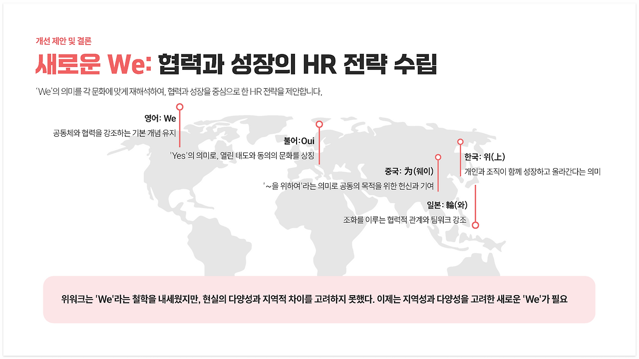 위워크가 이처럼 'We'의 문화적 번역과 의미적 다양성을 반영해 각 지역별 조직문화와 HR 전략을 현지화했더라면, 진정한 글로벌 조직으로서의 신뢰와 몰입을 확보할 수 있었을 것이다. 이제는 브랜드 메시지를 넘어서, 협력과 성장 중심의 '새로운 We'가 전략으로 설계되어야 한다. 'We'는 단지 말이 아니라, 문화와 제도로 구현되어야 한다.