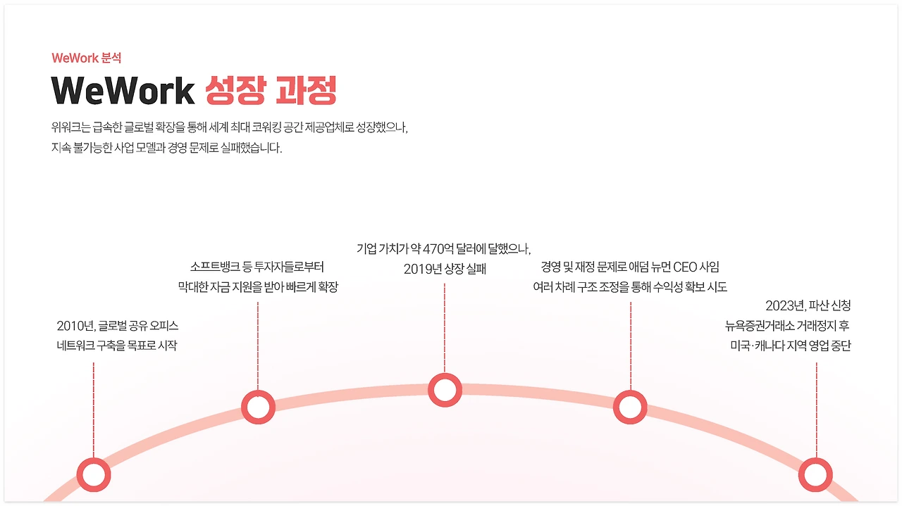 당시 위워크는 우버, 에어비앤비와 함께 ‘공유경제 3 대장’으로 불릴 정도로 시장의 주목을 받았고, 기업 가치 기준으로도 두 번째로 높은 평가를 받던 시점이 있었다. 그러나 지금은 이 리그에 참가조차 하지 못하고 있다. 현재 우버와 에어비앤비의 시가총액은 각각 약 223조 원, 111조 원에 달하는 반면, 위워크는 1차 IPO에 실패했고, 이후 기업가치가 폭락해 2023년에는 파산 보호 신청에까지 이르렀다. 단순한 외형 성장이나 비즈니스 모델의 문제만으로 보기 어려운 이 몰락은, 외부와 내부 모두에서 위워크가 구조적 문제를 안고 있었음을 보여준다.
