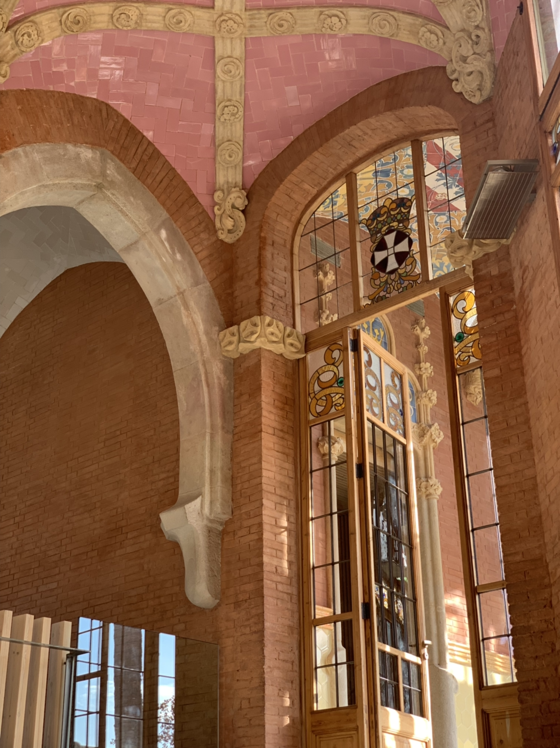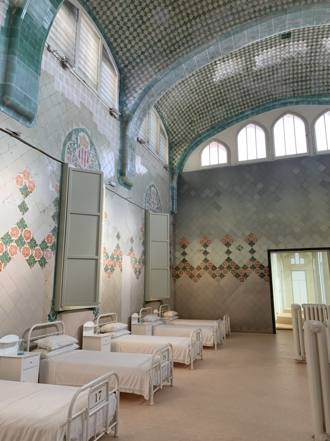 산 파우 병원은 실제로 바르셀로나의 역사적인 병원이었다. 산 파우 병원에서 태어난 많은 바르셀로나의 시민들 영상이 흘러나오고 있었다. 그리고 점점 건축가 특유의 색감과 장식이 건축에 투영되기 시작한다. 빈티지하고 부드러운 색감에 디테일한 타일 패턴들까지.. 정말 이게 병원이라고요? 입구에서의 의구심(내가 감히)을 잊은 채 입을 다물지 못할 정도로 훌륭한 공간이었다.