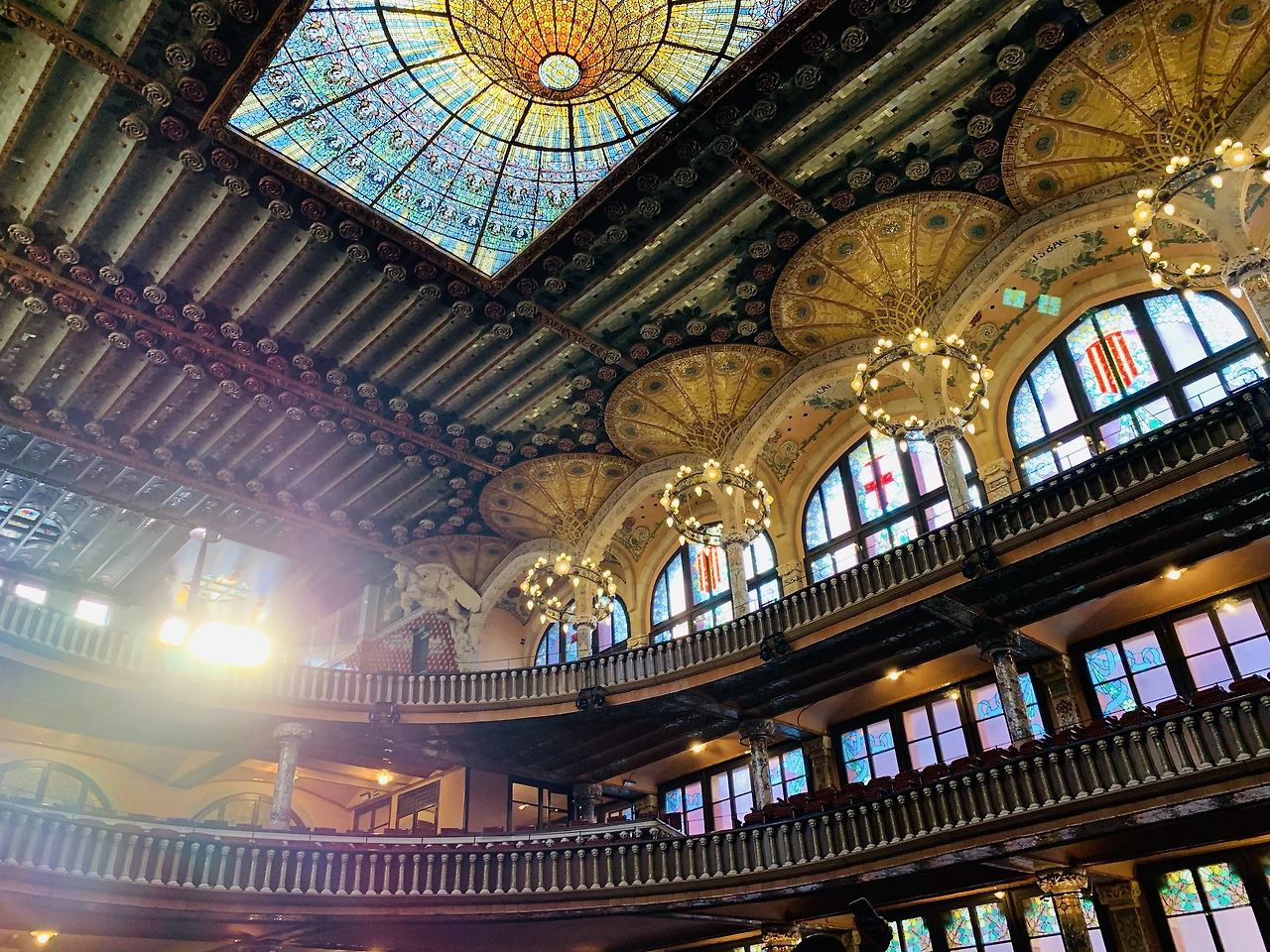 카탈루냐 음악당 공연을 혹시나 볼 수 있을까 하는 마음으로 아침 일찍 음악당으로 향했다. 점심 공연은 SOLD OUT이었고, 가이드 투어가 있다고 한다! 5분 뒤 시작이라 급하게 티켓을 사고 가이트 투어를 기다렸다. 까탈루냐 음악당은 공연장이라는 것이 믿어지지 않을 정도로 압도적인 공간이었다. 가우디는 신의 영역이라 말할 것도 없지만, 산파우병원과 까탈루냐음악당을 건축한 도메네크도 만만치 않은 건축가임을 인정할 수밖에 없었다.