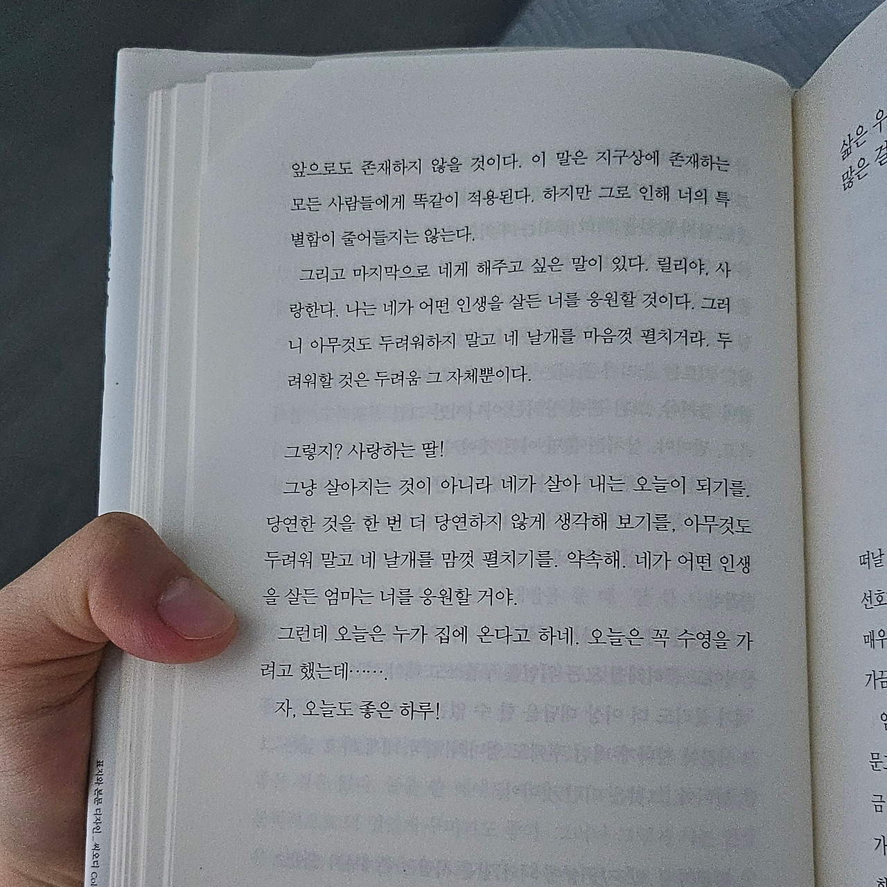 누군가를 원망할 새도 없이 하루하루 마음 졸이며 살아가는 날들 속에서 누군가의 다정한 마음을 읽었다. 작가가 그녀의 딸에게 쓴 편지는 나의 마음을 어루만져 주었다. 봉인이 해제된 듯 참았던 눈물이 엉엉 쏟아진다. 나는 얼마나 힘들었던 걸까. 힘들지 않으려고 얼마나 애쓰고 있었던 걸까.