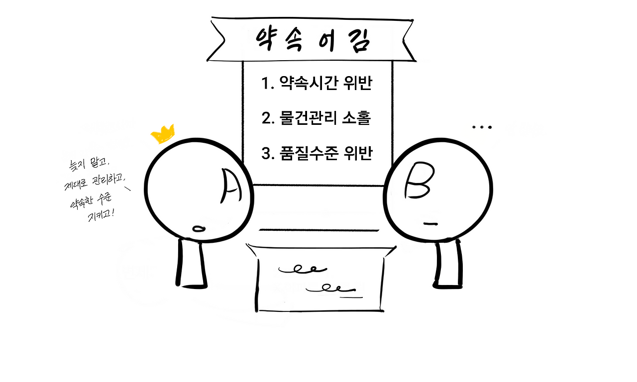 반면 기존 유형론을 탈피하는 것과는 별개로, 채무불이행을 다양한 모습으로 나누어 보는 작업은 의미가 있습니다. 닮은 것끼리 서로 묶고 비교를 하는 것만큼 사물의 본질에 빨리 다가갈 수 있는 방법도 없으니 말입니다. 이 책이 제시하고자 하는 모습은 세 가지입니다. ① 약속시간 지체, ② 물건관리 소홀, ③ 품질수준 위반, 이렇게 셋입니다. 이 셋은 고정된 유형이라기보다는 우리가 일상생활에서 가장 흔하게 접할 수 있는 약속 위반의 예시입니다. 그러니 위 셋에 너무 몰입하여 주객이 전도되는 일은 없도록 합시다. 여러 번 강조하지만 채무불이행은 위 셋 외에도 다양한 모습으로 존재할 수 있습니다.
