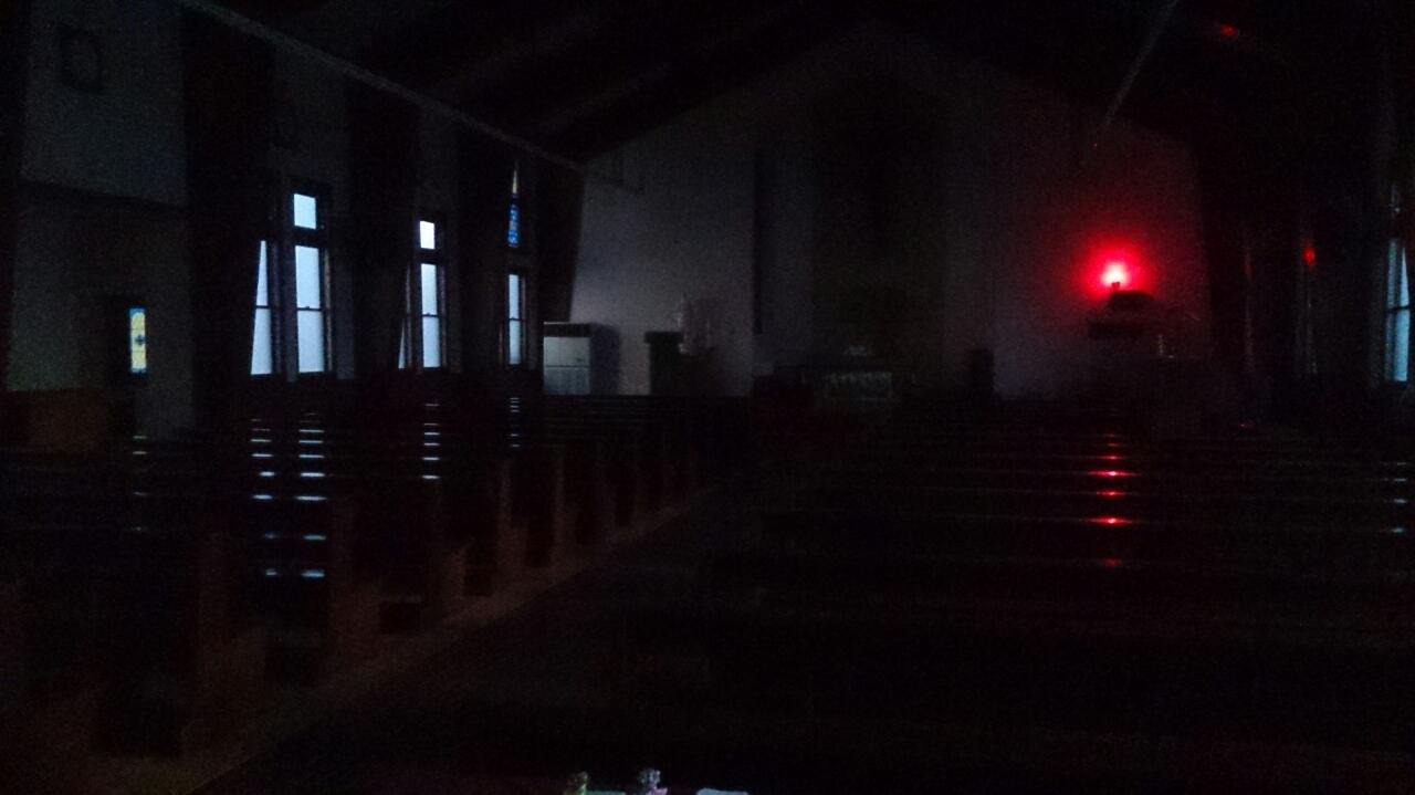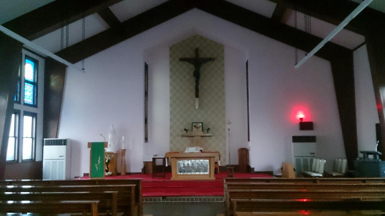아무도 없는 텅 빈 벤치식 목재 의자들. 쥐 죽은 듯 고요하며 무거운 공기. 실내등 불빛을 받아 차분하지만 아름답게 다가오는 스테인드글라스 창문들. 나의 눈길을 자그맣고 아담한 성당을 입구로부터 훑어 저 안쪽의 제대까지 다다랐다.