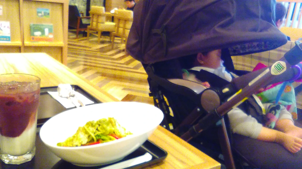 주문을 하고 번호표를 받은 후 유모차를 끌고 자리를 물색합니다. 오늘은 지난번과 달리 기다란 소파가 있고 그에 맞는 기다란 테이블이 있는 곳으로 가서 자리를 잡습니다. 아빠가 자리를 잡은 걸 확인한 후 나는 아빠에게 휴식 시간을 주기로 했어요. 눈을 감았어요. 히힛.