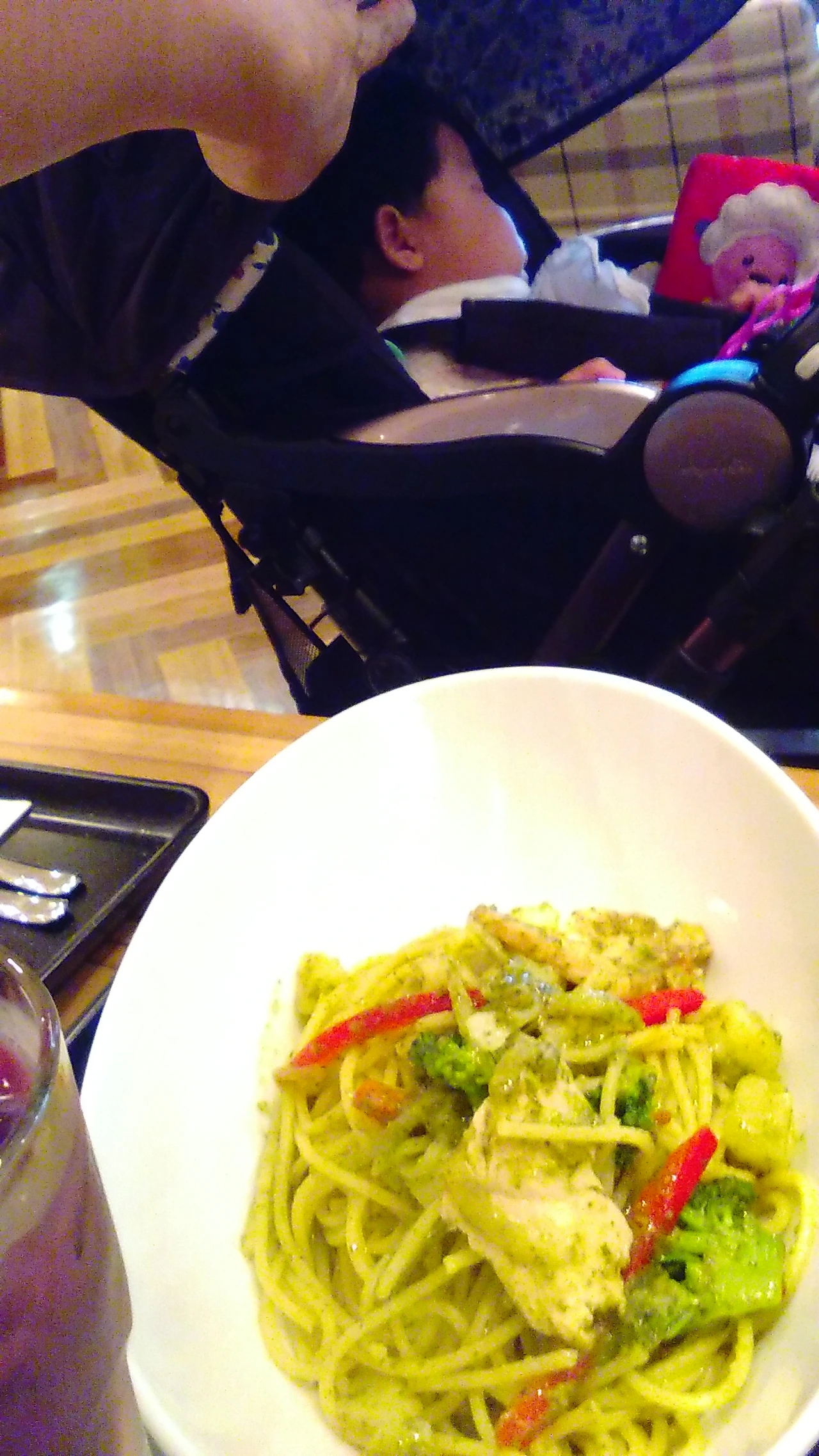 고도모관을 한 바퀴 유모차를 밀고 돌아온 후 아빠는 깨닫습니다. 2시가 되었는데 아직 점심을 먹지 못했다는 사실을요. 엘리베이터를 타고 엄마가 스파게티가 맛있다고 알려준 3층 커피숍을 향합니다. 아빠는 메뉴를 보고 토마토소스 스파게티를 고르려 하다가 - 아빠가 맨날 시키는 메뉴입니다 - 바로 옆 사진의 초록빛 색깔을 띤 새로운 메뉴에 도전해 보기로 합니다.