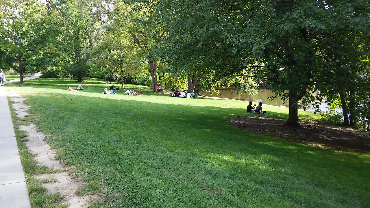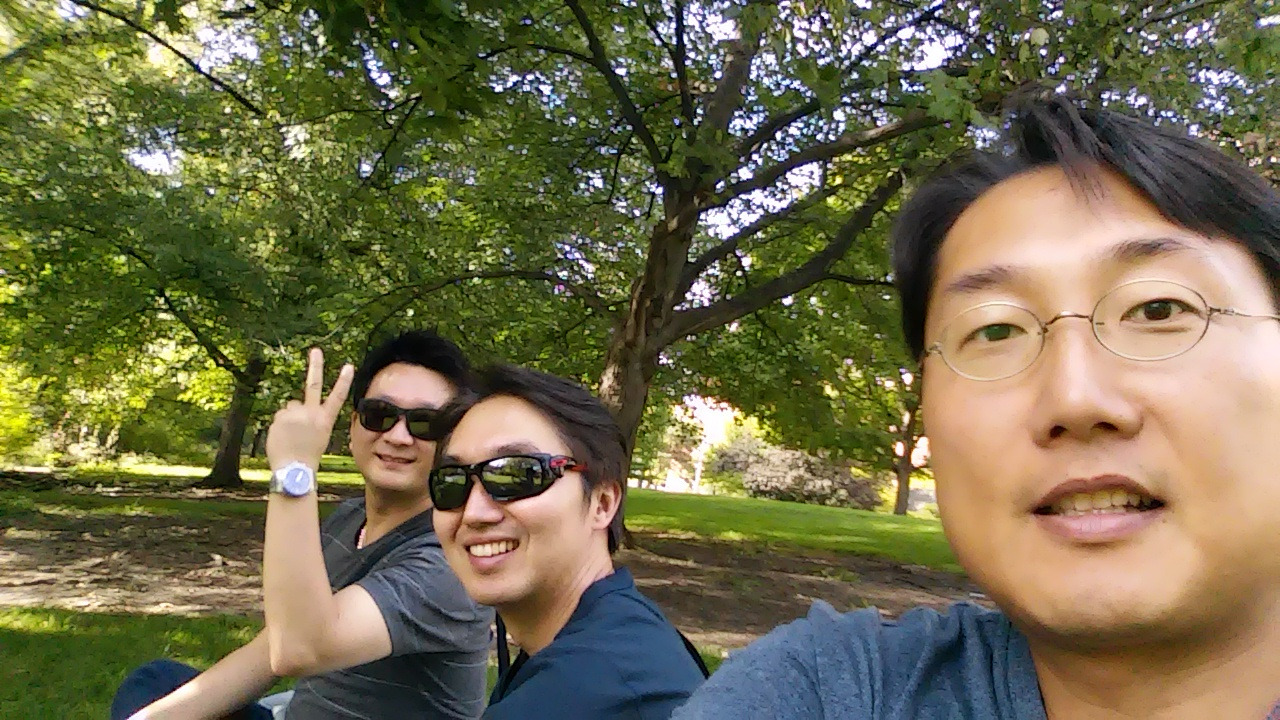 잔디밭은 어느 곳이나 깔끔하게 정리되어 있었고 아무 데나 앉아서 책을 읽거나 음악을 듣고 싶게 만들었습니다. 결국 서울에서 함께 갔던 또 다른 친구 Y와 저 그리고 미시간 친구 J는 평화롭게 흘러가는 개천 옆 잔디에 엉덩이 자국을 남기게 되었습니다.