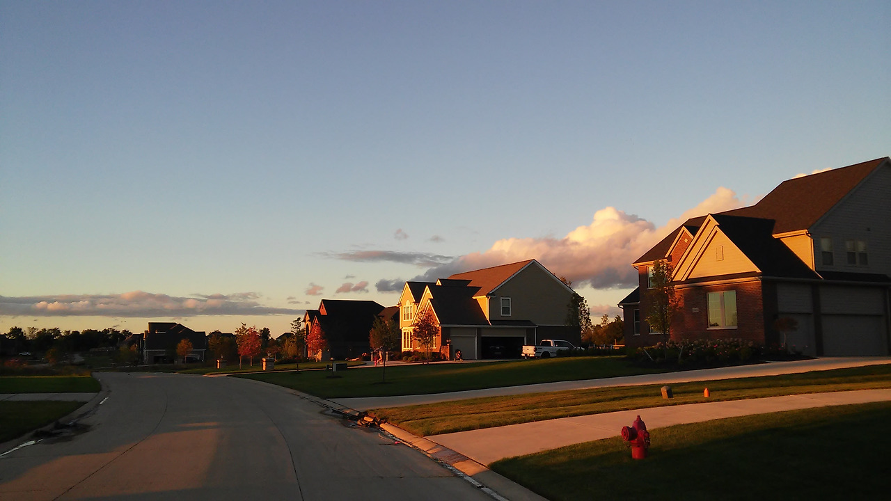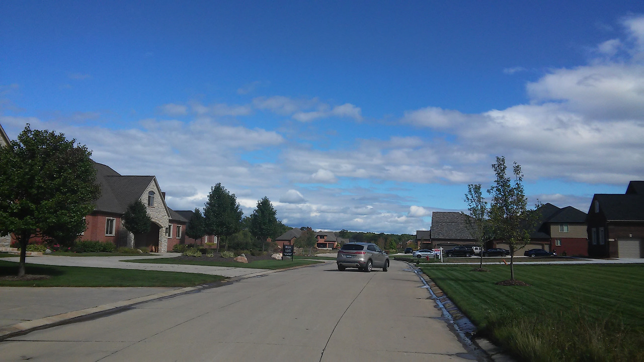 곡선으로 길게 이어지는 메인 도로 양옆으로 대부분 2층으로 지어진 독립 가옥들이 보였다. 마치 사회에서 어느 정도 성공을 거둔 이들에게서 느껴지는 분위기 같은 것이 동네 풍경에서 느껴졌다. 눈길 가는 어느 집들에나 초록빛 잔디가 깔려 있었는데 이 즈음 하늘은 맑아져 파아란 하늘빛과 하얀 구름 그리고 초록빛 잔디밭이 그야말로 눈이 시리도록 선명한 빛의 어울림을 발하고 있었다.